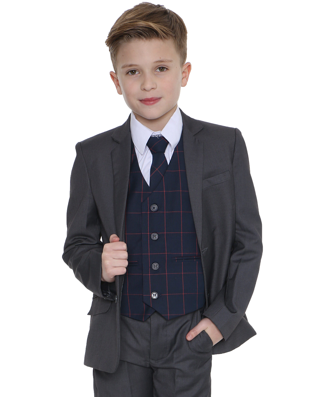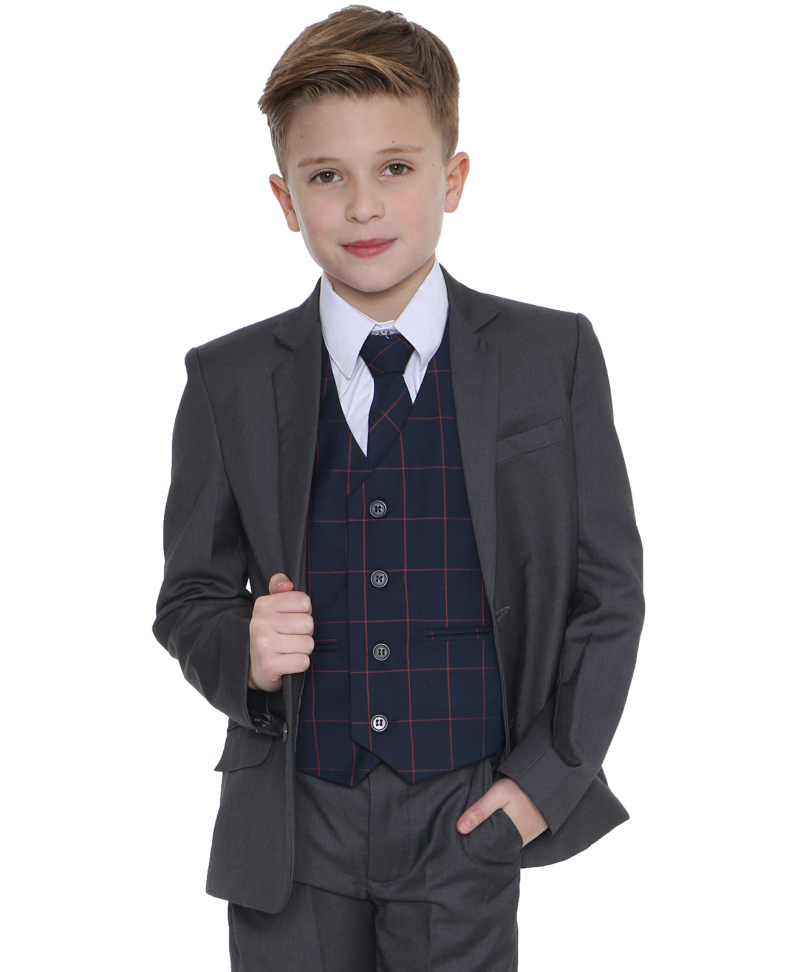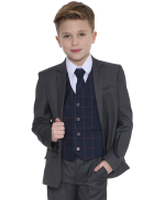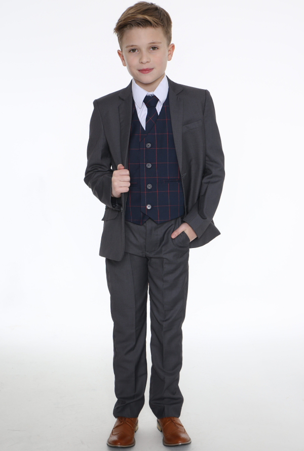 This stylish grey suit features a striking checked waistcoat and coordinating tie. The waistcoat’s design incorporates various lines of white and grey, making it the focal point of the ensemble. Subtle hints of navy within the pattern complement the grey jacket and trousers. The suit is completed with a crisp white shirt.