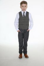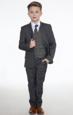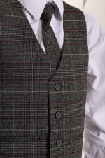 This Stylish Grey suit is incredibly eye catching with its Chequered Waistcoat and matching tie. The design of the waistcoat has various lines of White and Grey which makes this waistcoat the dominant piece of the suit. Subtle hints of red running throughout the pattern compliment the grey jacket and trousers. The whole suit is finished off with a crisp white shirt