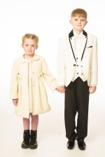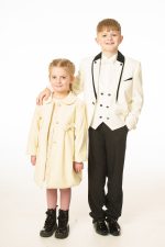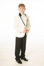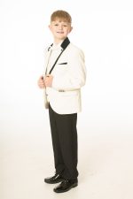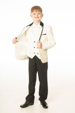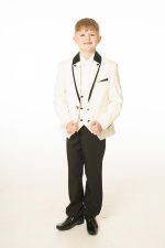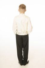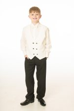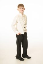 This boys full 5 piece suit comes complete with jacket, shirt, waistcoat, trousers and bow tie