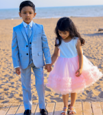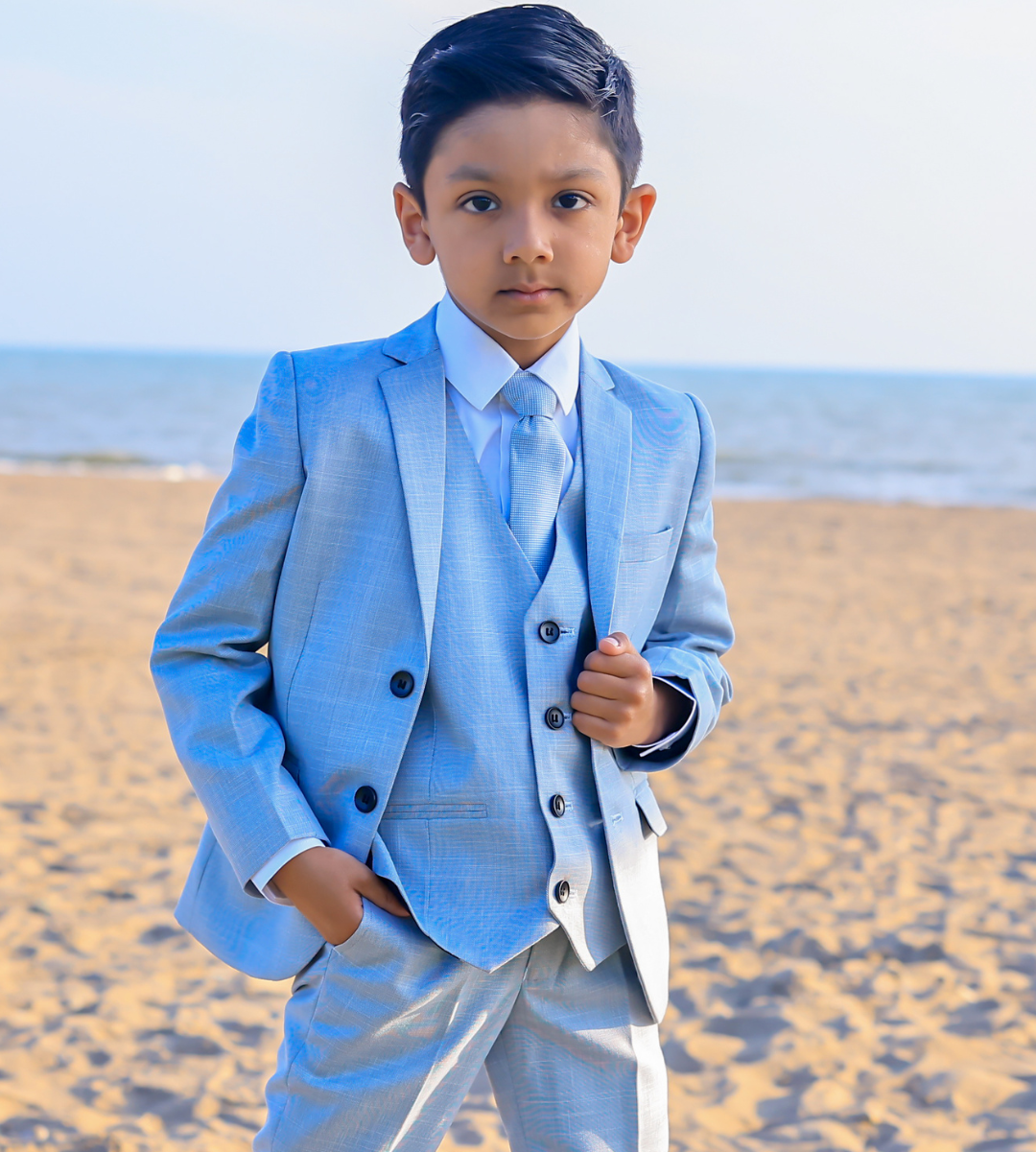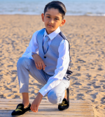 The most perfect summer suit, a premium luxury outfit by designers Milano Mayfair. This complete 5 piece slim fit suit comes with a 2 Button Jacket, trousers with adjustable waist, matching 4 button waistcoat, crisp white shirt and a tie to complement the suit. Make your little gent look stunning and make every moment memorable with this suit. This premium suit comes in a Milano Mayfair suit bag.