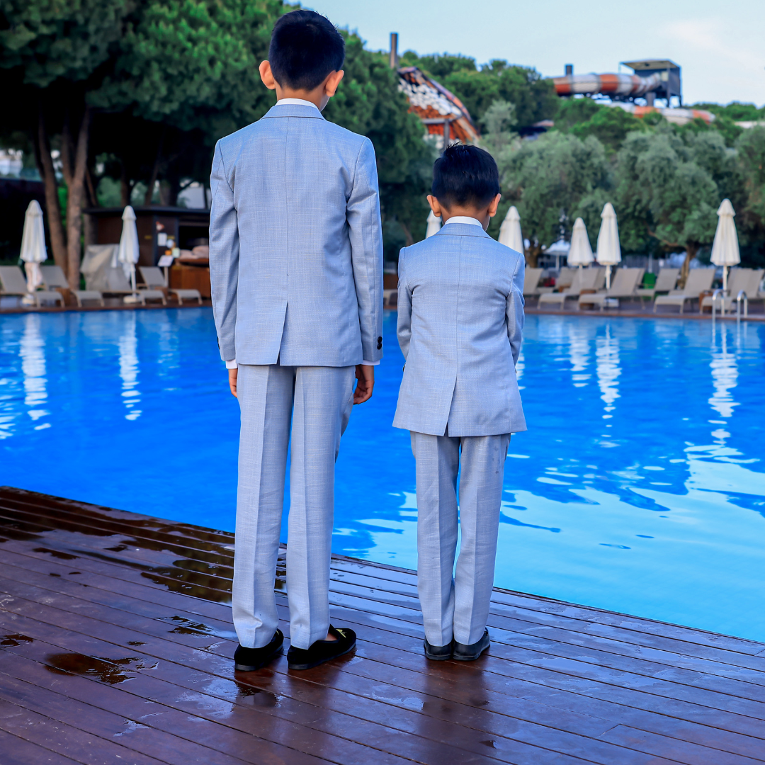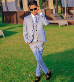The most perfect summer suit, a premium luxury suit by designers Milano Mayfair. This complete 5 piece slim fit suit comes with a 2 Button Jacket, trousers with adjustable waist, matching 4 button waistcoat, crisp white shirt and a tie to complement the suit. Make your little gent look stunning and make every moment memorable with this suit. This premium suit comes in a Milano Mayfair suit bag.