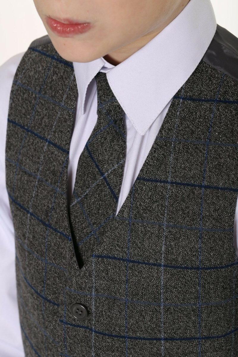 This stylish navy suit features an eye-catching chequered waistcoat complemented by a matching tie. The waistcoat’s design includes various lines of white and grey, making it the focal point of the ensemble. Subtle accents of blue throughout the pattern complement the navy jacket and trousers. The overall look is polished with a crisp white shirt.