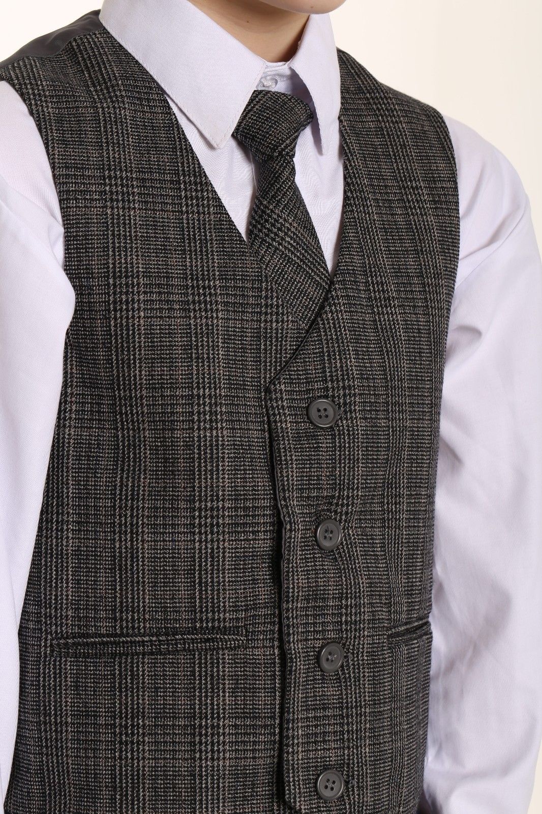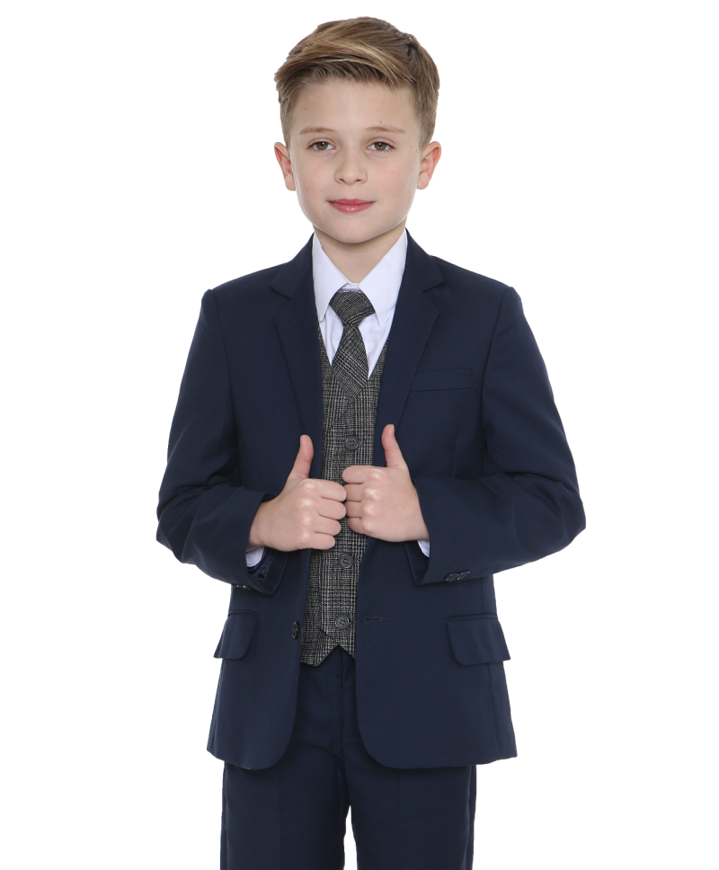 This stylish navy suit features a striking chequered waistcoat and coordinating tie. The waistcoat’s design includes various lines of white and grey, making it the focal point of the ensemble. Subtle grey accents throughout the pattern complement the navy jacket and trousers. The look is completed with a crisp white shirt.