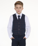 This Stylish Navy suit is incredibly eye catching with its Chequered Waistcoat and matching tie. The design of the waistcoat has various lines of White and Grey which makes this waistcoat the dominant piece of the suit. Subtle hints of red running throughout the pattern compliment the navy jacket and trousers. The whole suit is finished off with a crisp white shirt