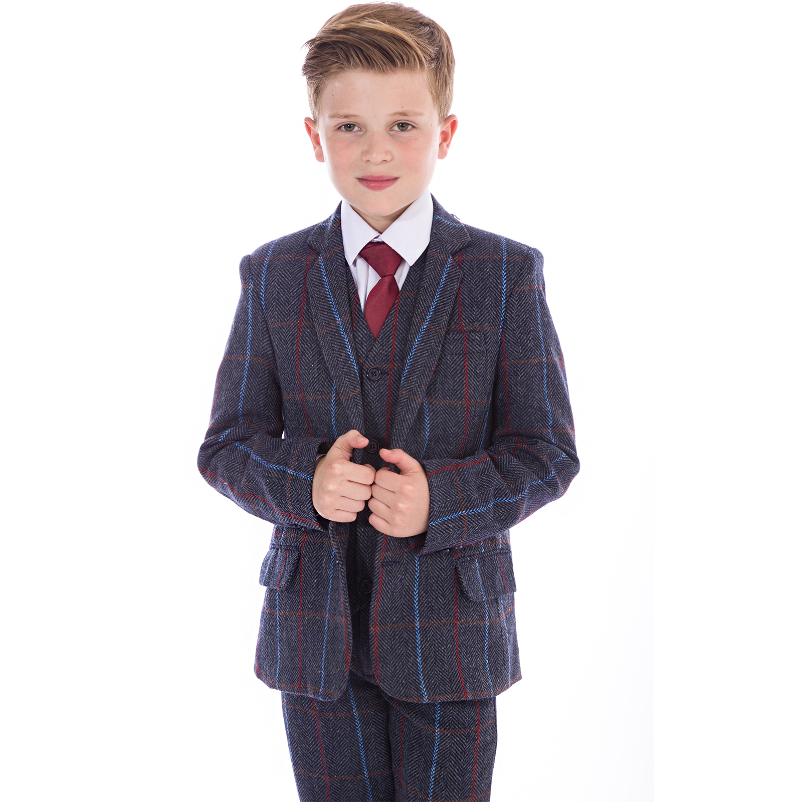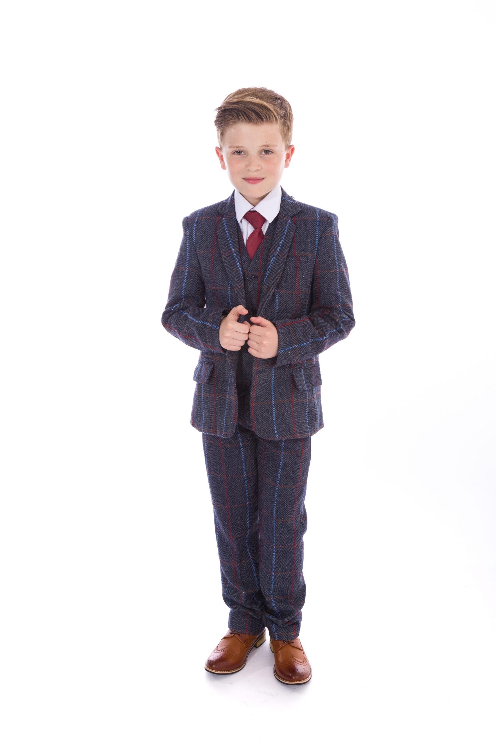 This stylish suit is an excellent choice for those seeking a classic tweed ensemble. Featuring a herringbone pattern, this five-piece suit includes a meticulously crafted tweed blazer and waistcoat, matching tweed trousers, a crisp white shirt, and a Burgundy tie to complete a polished look. Made with high-quality materials and precise stitching, this suit is suitable for any special occasion. With the current trend of herringbone tweed, it is sure to make a distinguished impression.