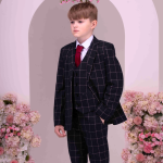 - Waistcoat: A navy and white check waistcoat to match the trousers and jacket.