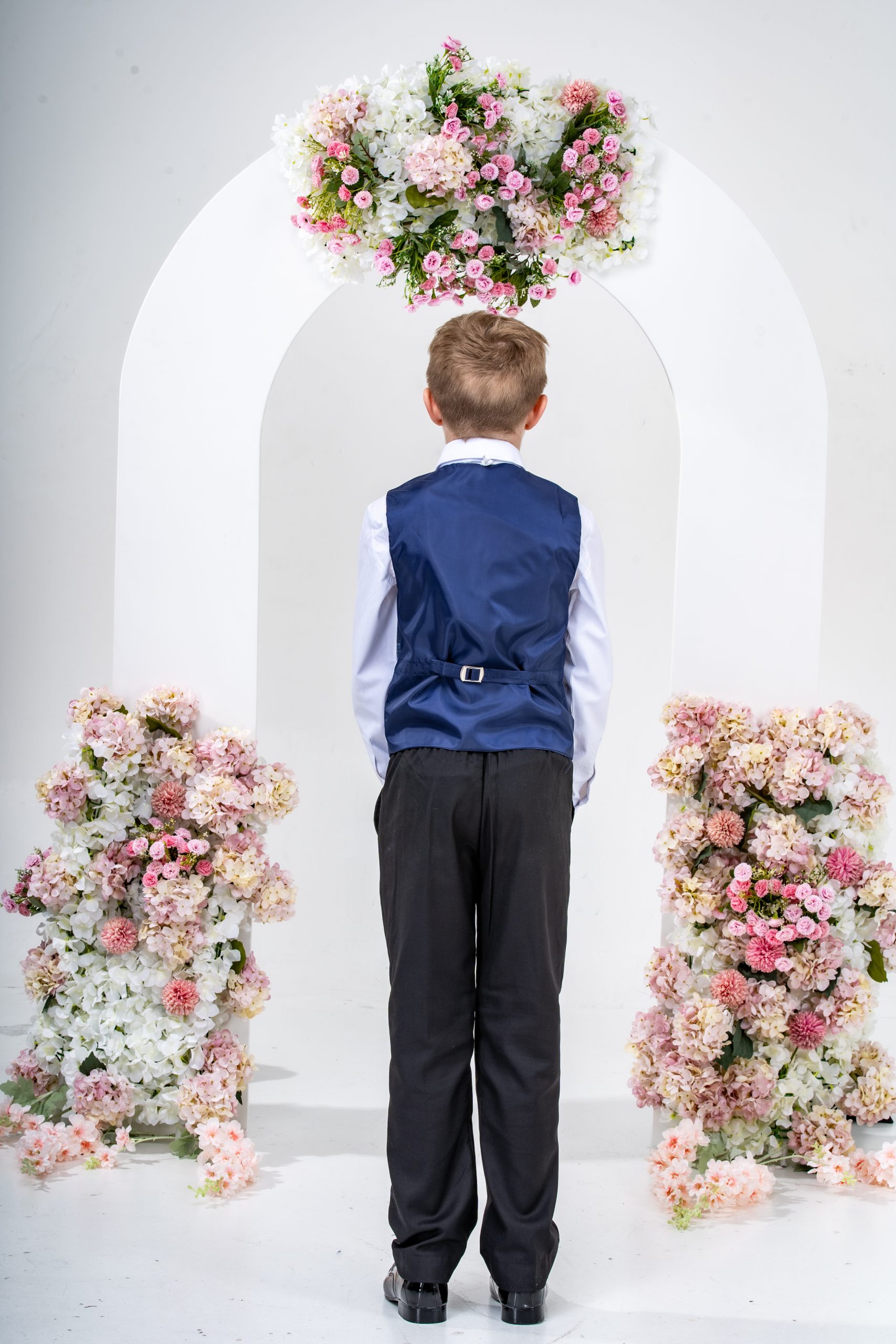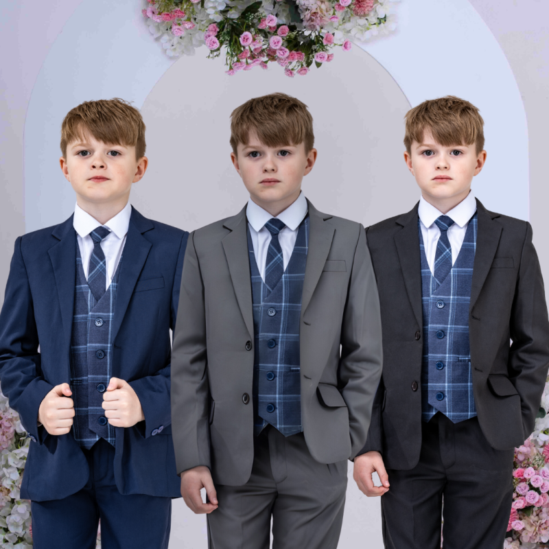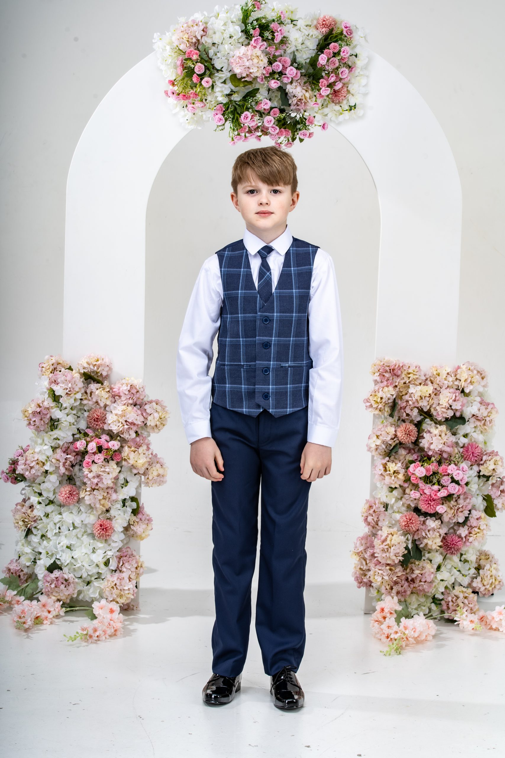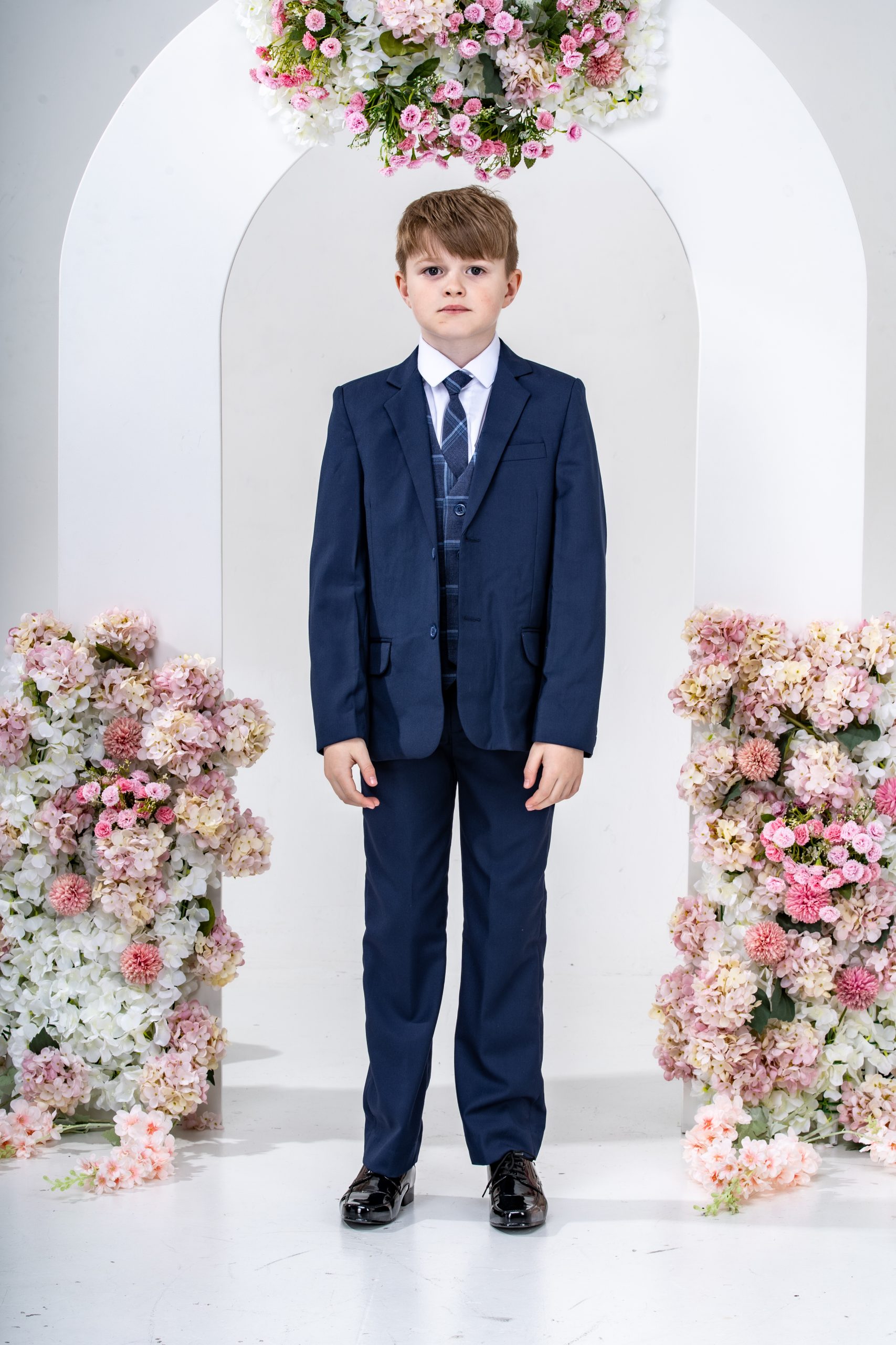 This elegant suit is part of the Vivaki Collection, featuring an attention-grabbing navy check waistcoat and matching tie, making it ideal for any special occasion.