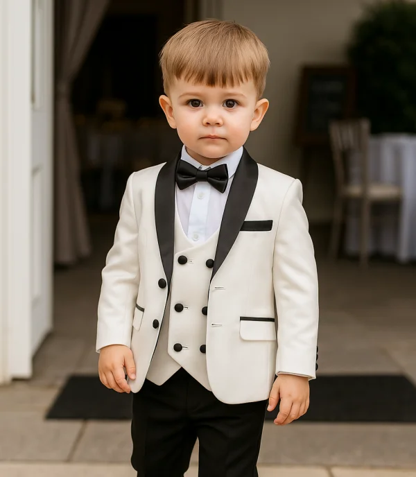 A premium luxury suit by designers Milano Mayfair. This complete 5 piece slim fit suit comes with a 2 White Button Jacket, trousers with adjustable waist, matching 4 button waistcoat, crisp white shirt and a bow tie to complement the suit. Make your little gent look stunning and make every moment memorable with this suit. This premium suit comes in a Milano Mayfair suit bag.