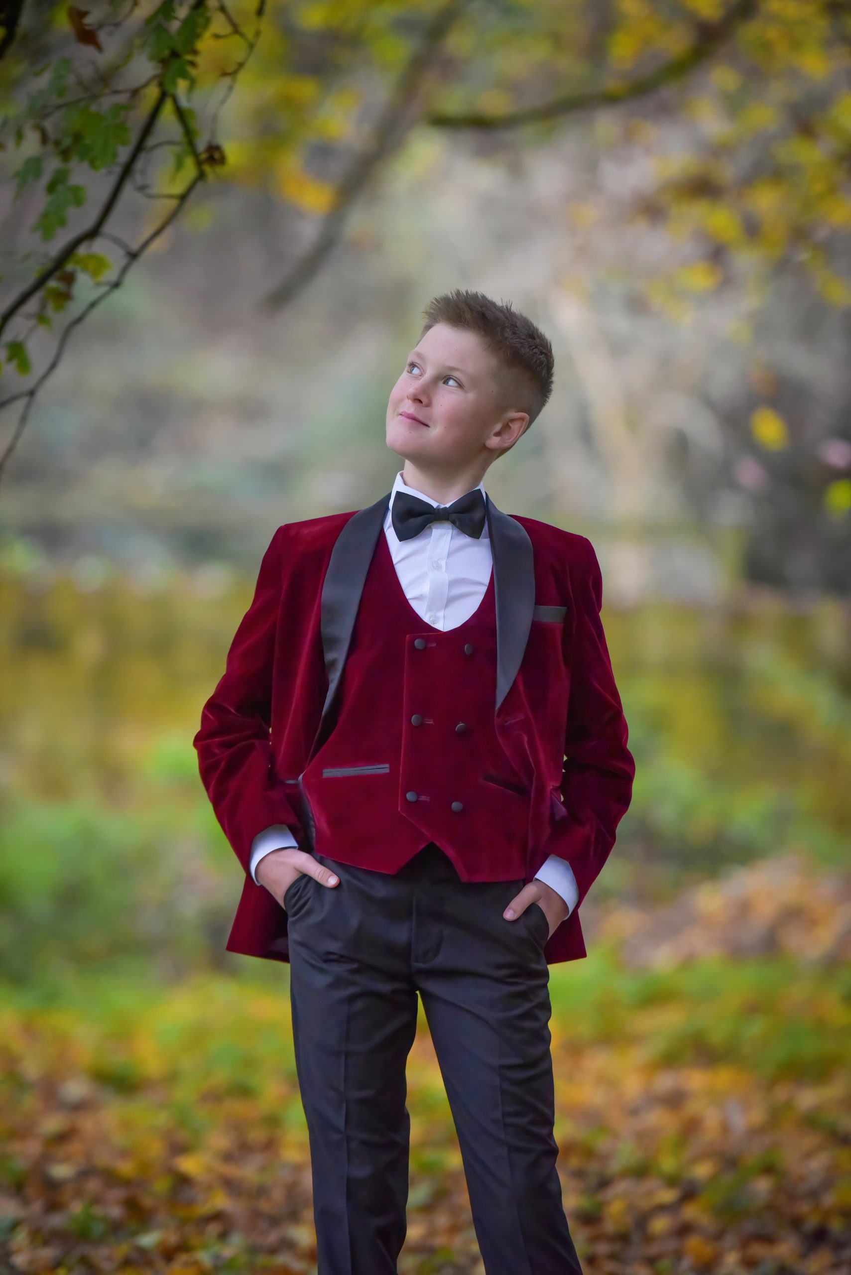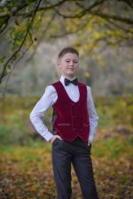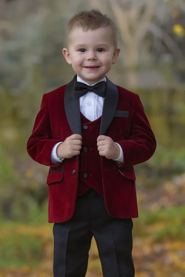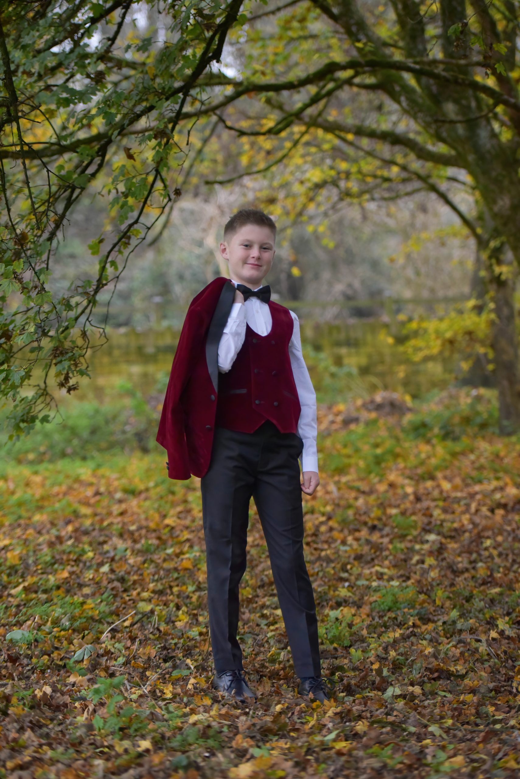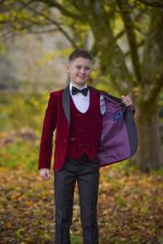 A premium luxury suit by designers Milano Mayfair. This complete 5 piece slim fit suit comes with a 2 Velvet Button Jacket, trousers with adjustable waist, matching 4 button waistcoat, crisp white shirt and a bow tie to complement the suit. Make your little gent look stunning and make every moment memorable with this suit. This premium suit comes in a Milano Mayfair suit bag