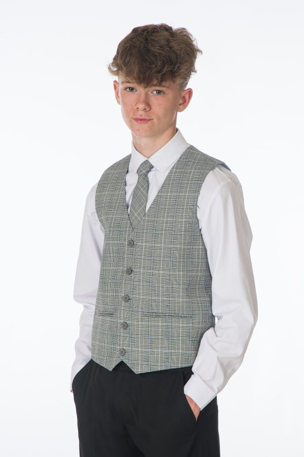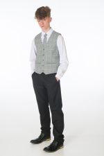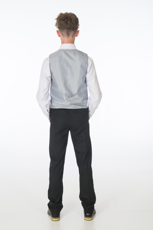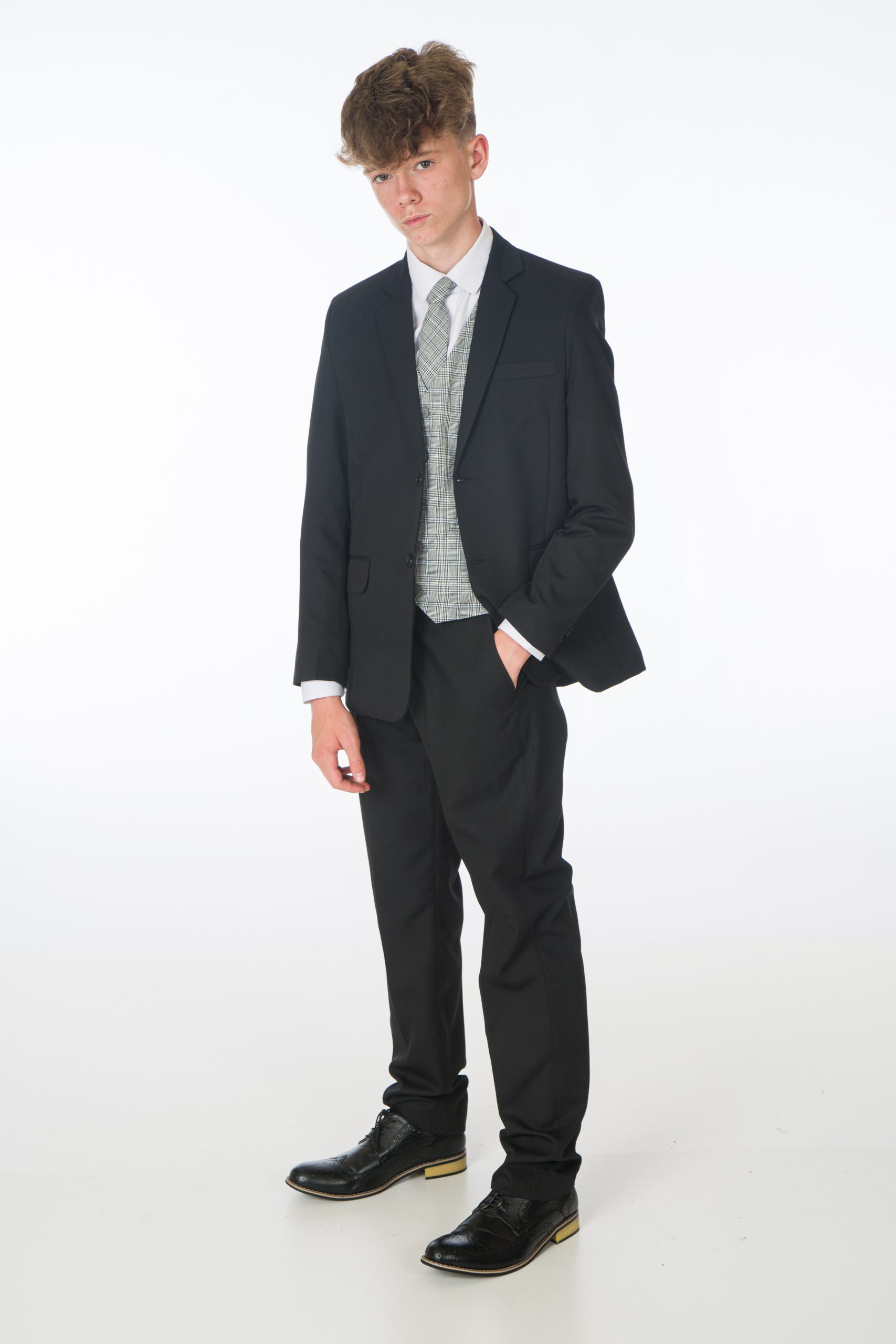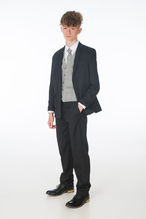 The set includes a tailored, two-button black suit jacket; a matching navy waistcoat with full lining and an adjustable clasp for a comfortable fit; a white long-sleeved collared shirt; grey elasticated trousers; and a coordinating tie to complete the look.