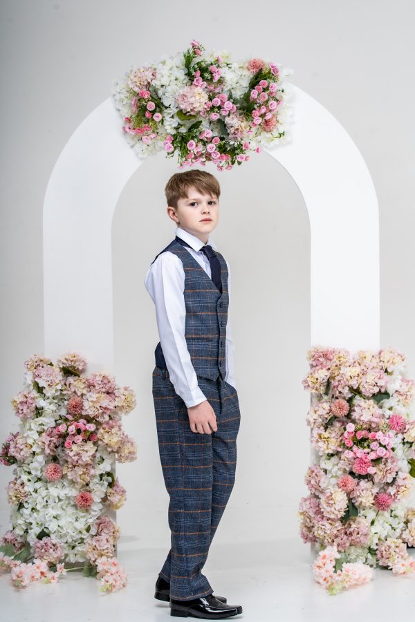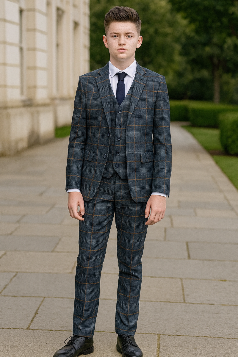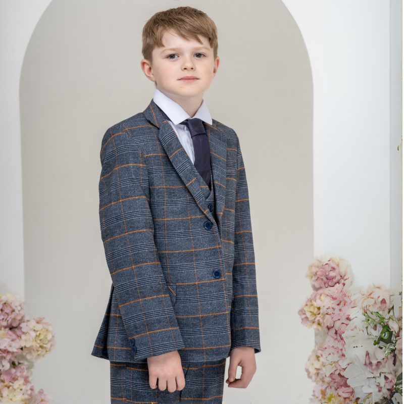 This elegant 5-piece suit is ideal for all formal occasions, featuring a distinctive blue design with orange check detailing.