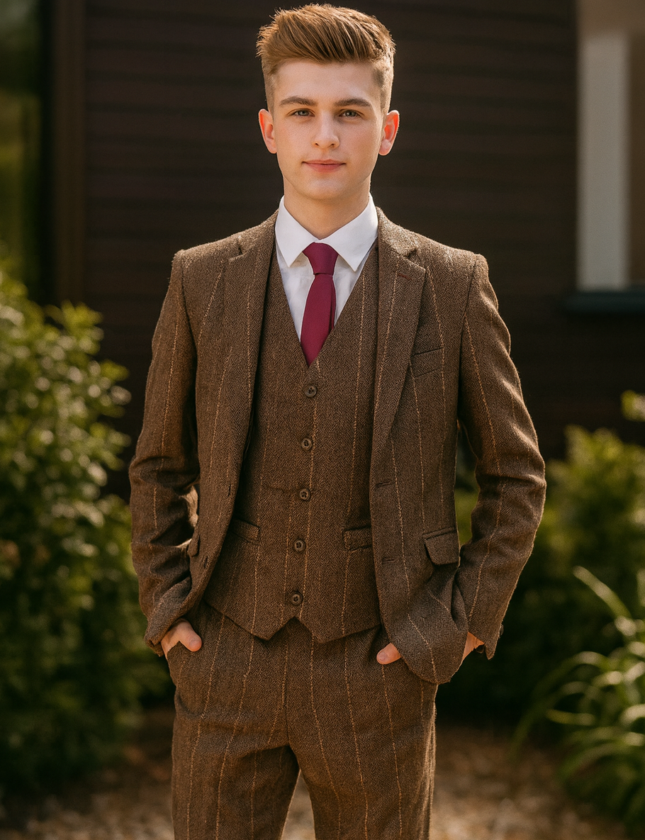 This elegantly styled suit is an ideal choice for those seeking a classic tweed ensemble. The check-patterned, five-piece suit features a meticulously crafted tweed blazer and waistcoat, matching tweed trousers, a crisp white shirt, and a red tie to complete a polished appearance. Made from high-quality materials with superior stitching, the suit includes a finely detailed pocket that adds to its refined tailoring. Perfect for formal occasions or weddings, this suit allows your young boy to stand out with sophistication.
