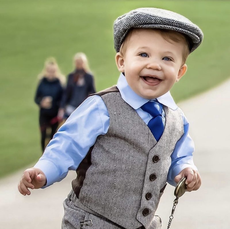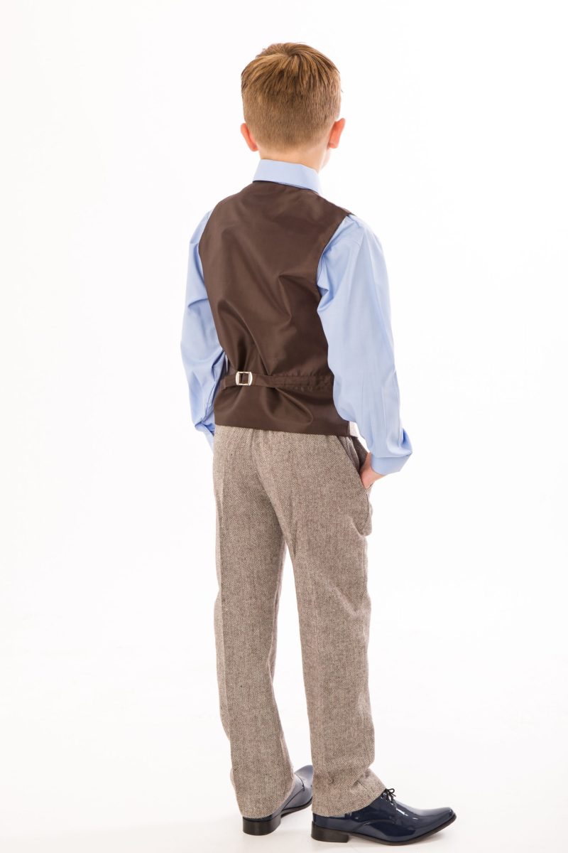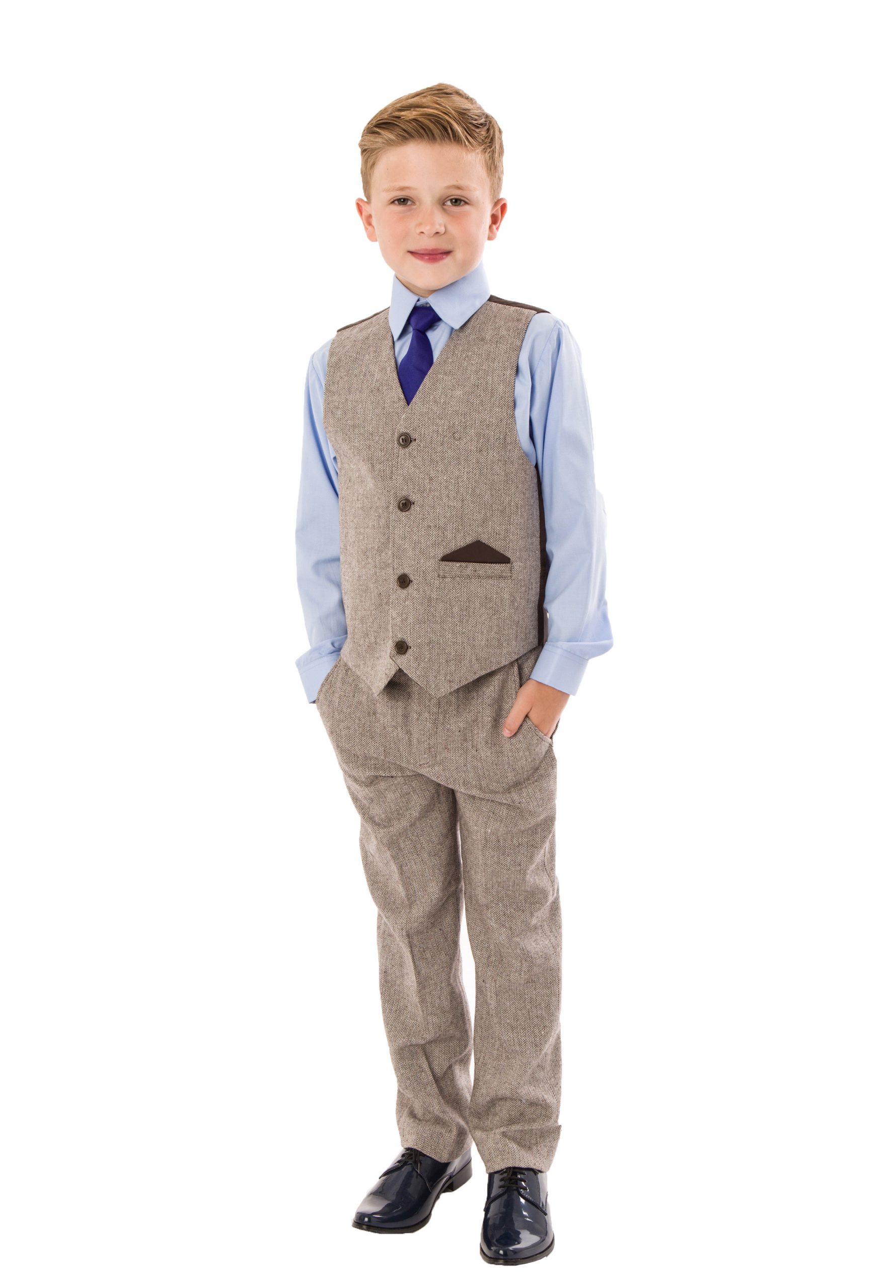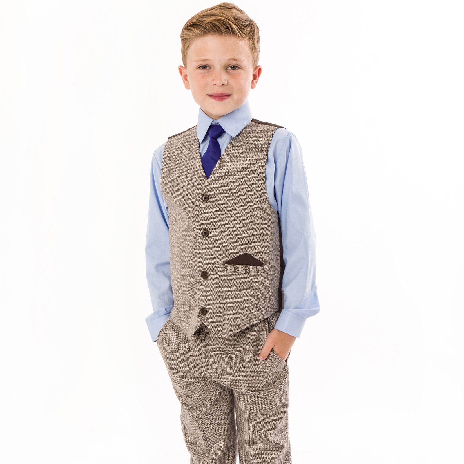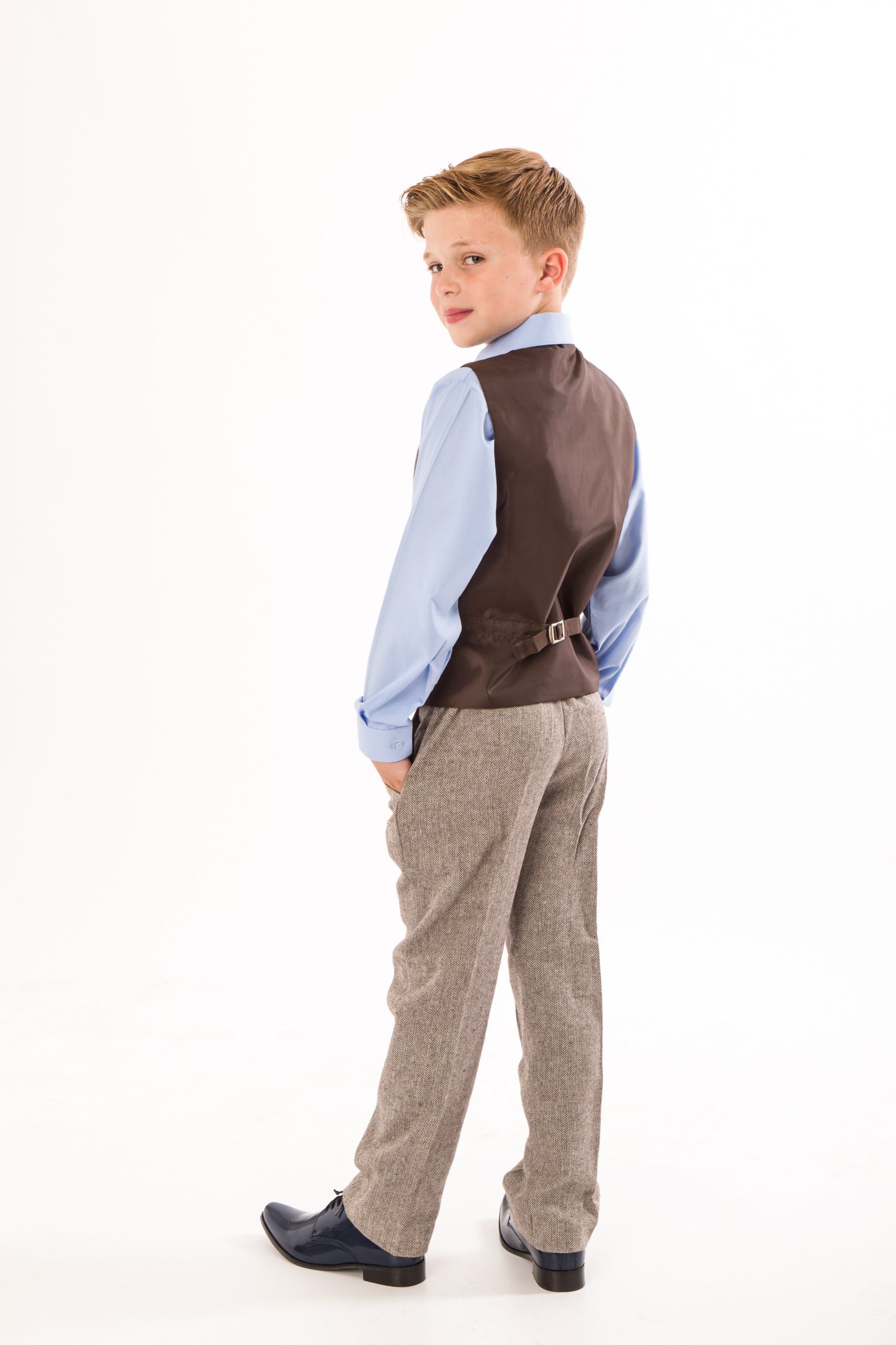 A stylish brown herringbone tweed suit, ideal for enhancing your young boy’s appearance and helping him look like a refined gentleman. This high-quality, fashionable suit includes a fitted waistcoat and trousers crafted from elegant brown herringbone tweed. A crisp blue shirt and matching blue tie complete the sophisticated look.