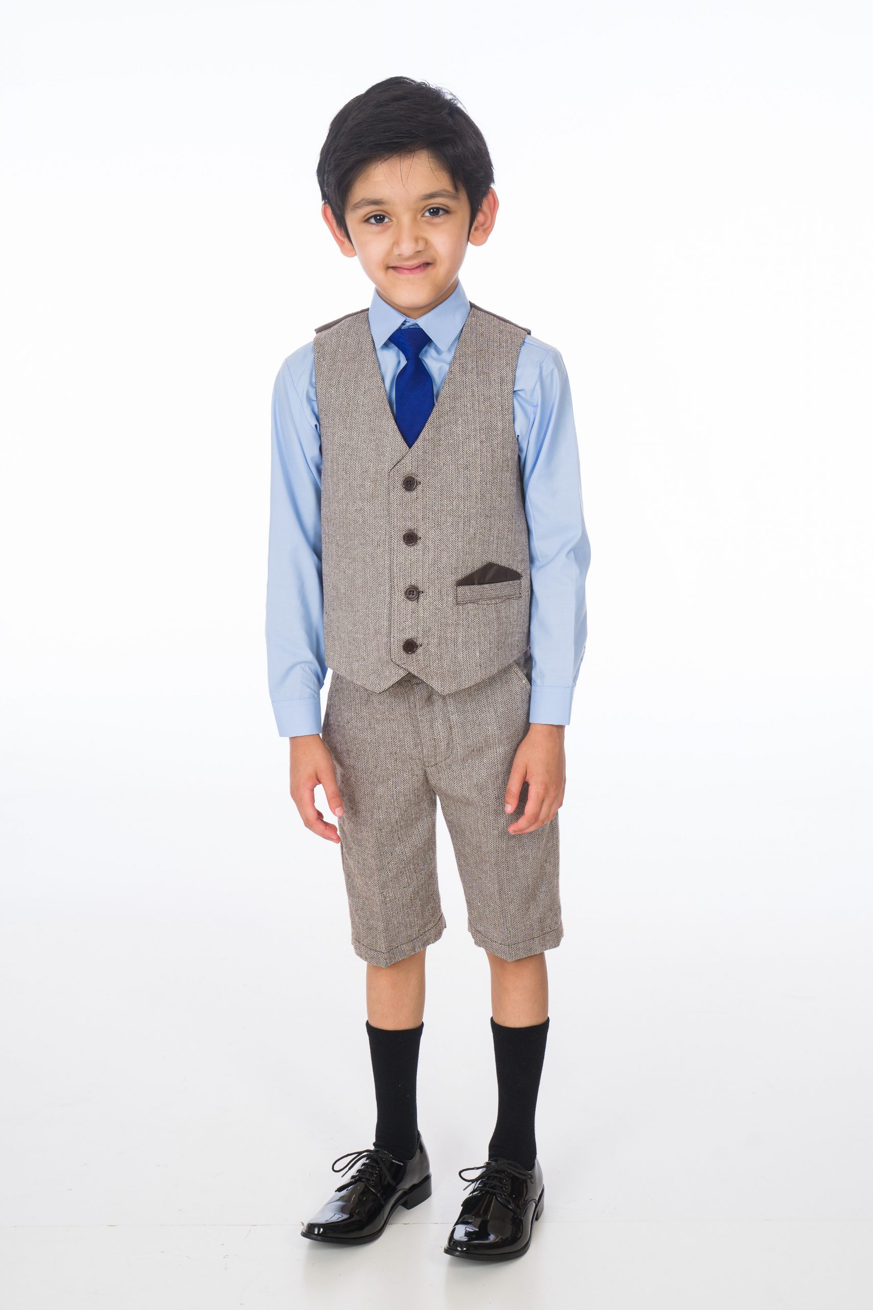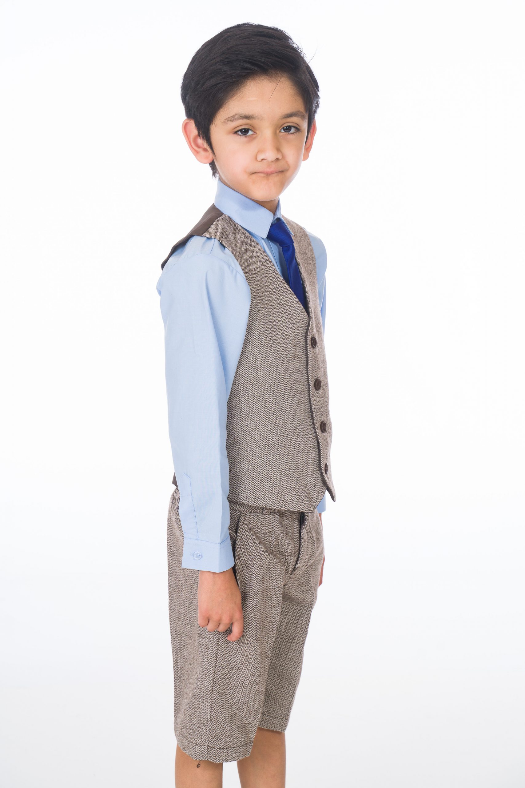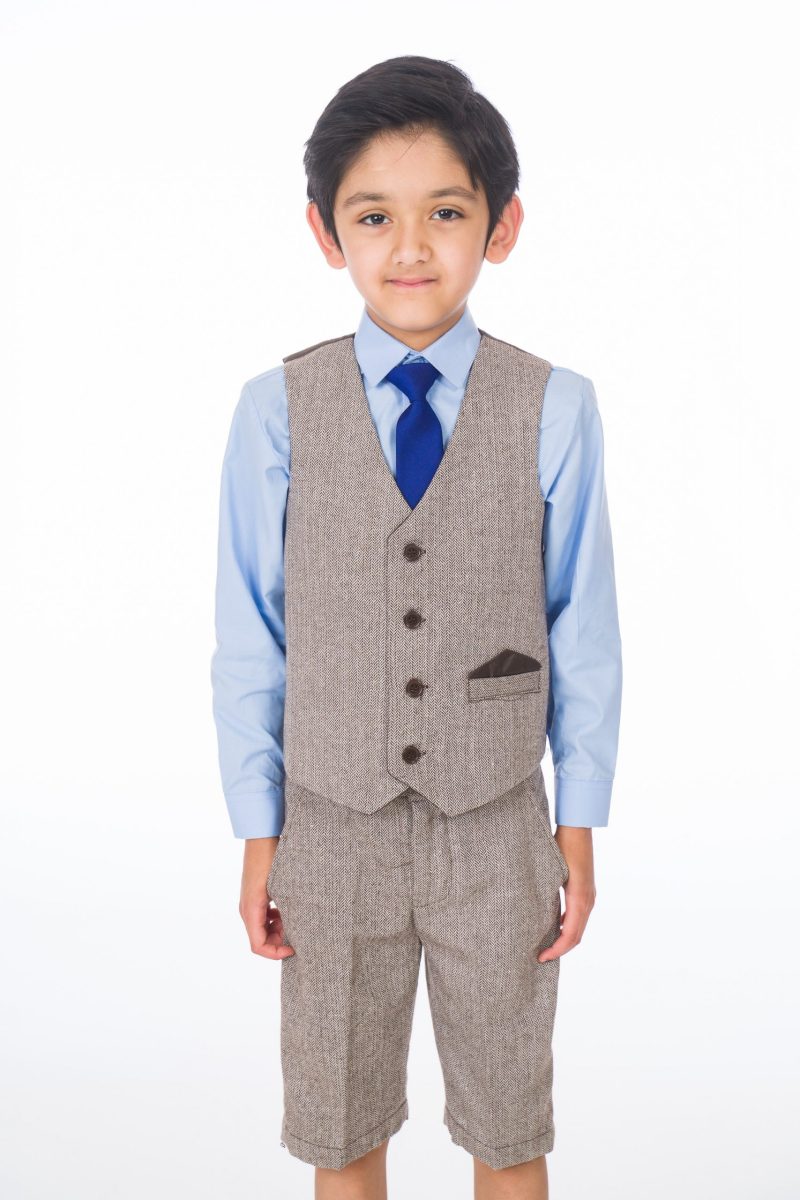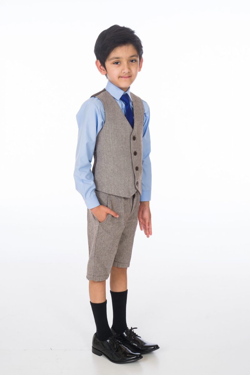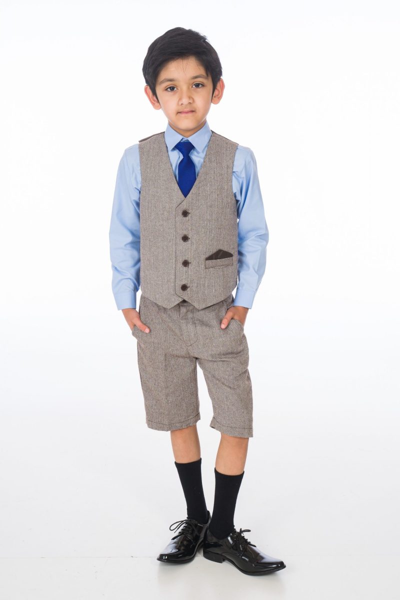 A stylish brown herringbone tweed short suit designed to enhance your young boy’s appearance and promote a polished, refined look. Crafted from high-quality, elegant brown herringbone tweed, this suit includes a fitted waistcoat and trousers. A crisp blue shirt and a coordinating blue tie complete the sophisticated ensemble.