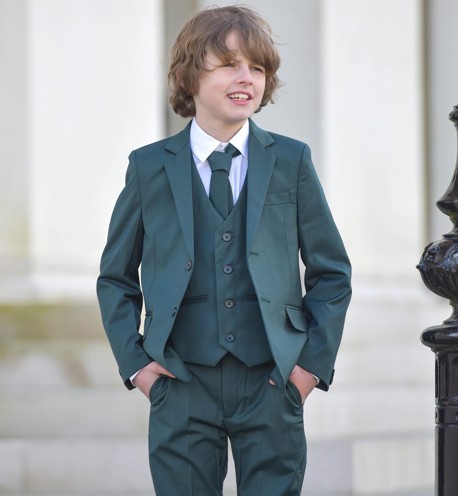 The boys’ Dark Green Premium Suit features a sleek, tailored design in a dark green fabric, offering a contemporary yet timeless appearance. Paired with a matching dark green tie, the suit combines classic sophistication with a subtle contrast, making it suitable for formal occasions such as weddings, parties, or special events. The stone shade adds a refined touch, while the navy tie introduces an element of versatility and elegance.