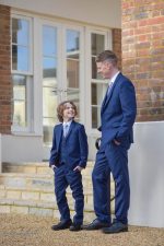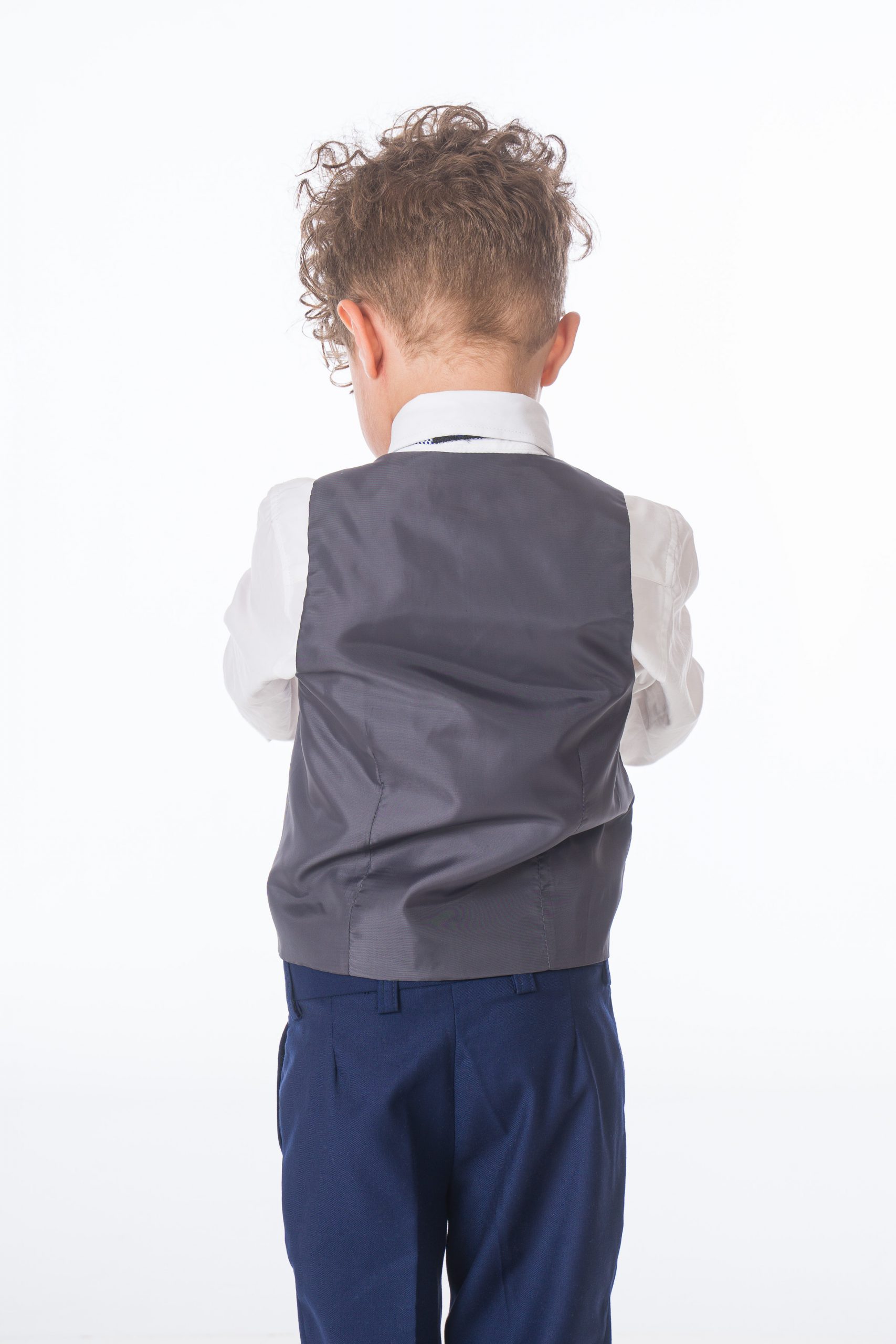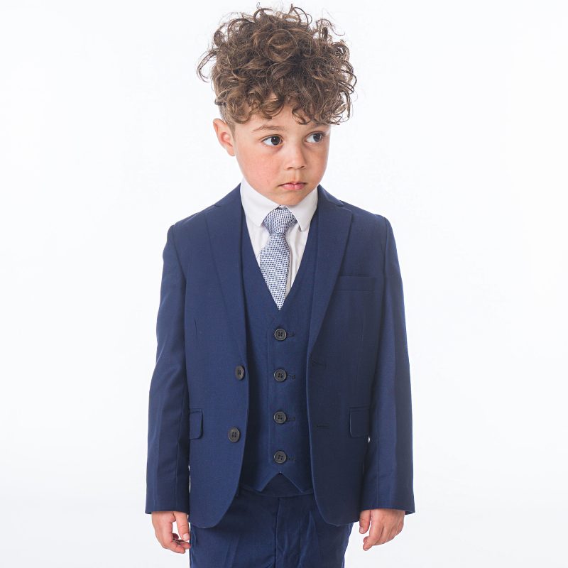 A premium luxury suit by Milano Mayfair. This complete five-piece slim-fit suit includes a two-button jacket, trousers with an adjustable waist, a matching four-button waistcoat, a crisp white shirt, and a coordinating tie. Perfect for ensuring your young gentleman looks distinguished and makes every occasion memorable. The suit is presented in a Milano Mayfair suit bag for convenience.