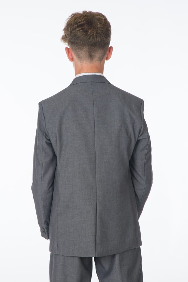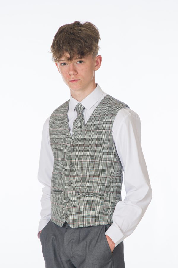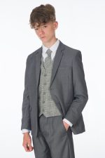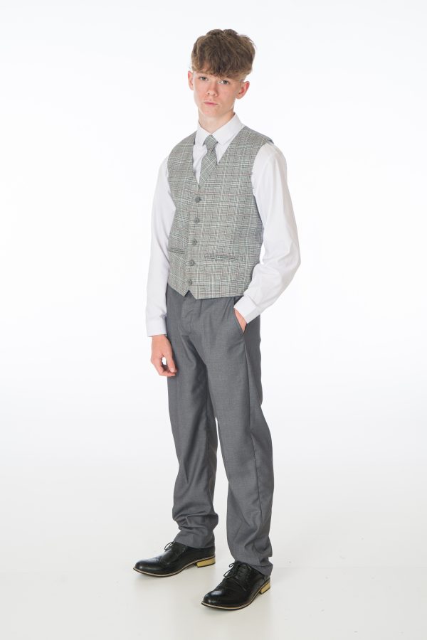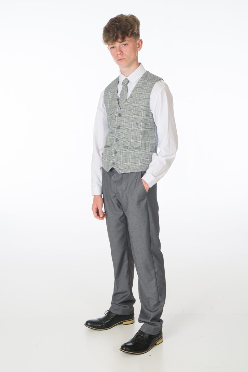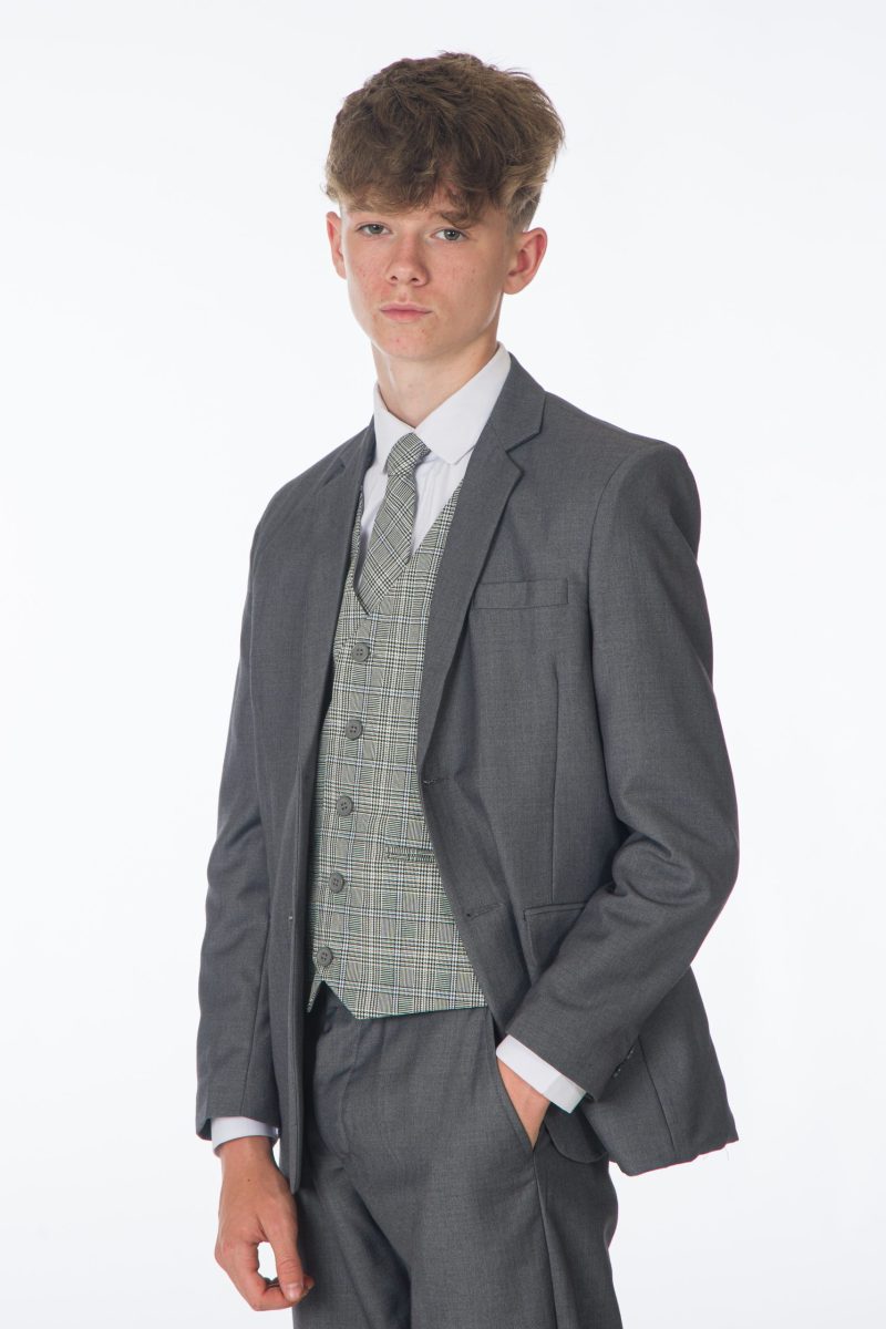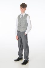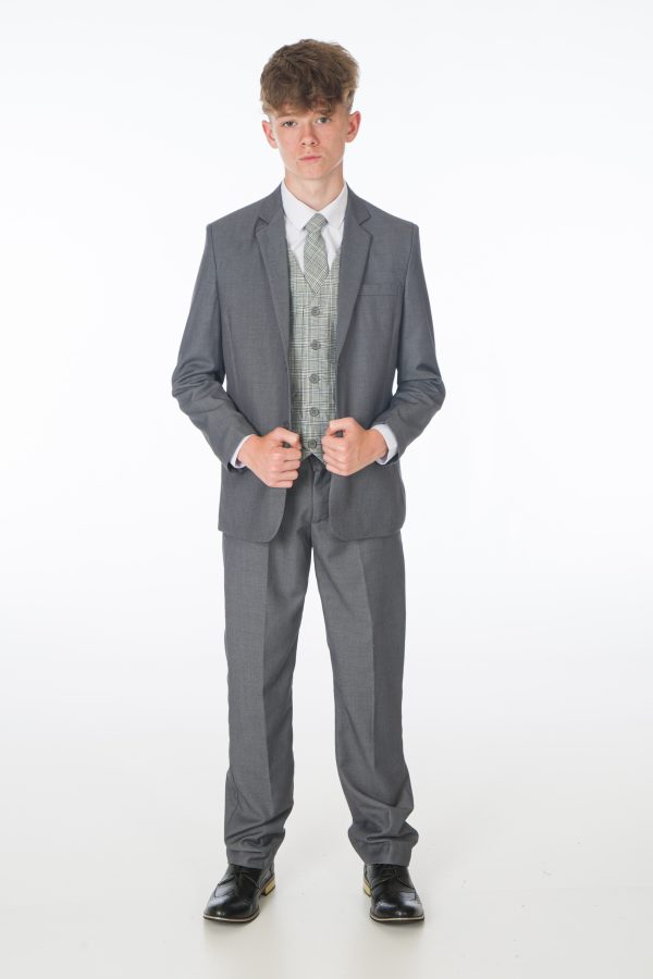 The set includes a tailored, two-button grey suit jacket; a matching navy waistcoat with full lining and an adjustable clasp for a comfortable fit; a white long-sleeved collared shirt; grey elasticated trousers; and a coordinating tie to complete the look.