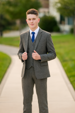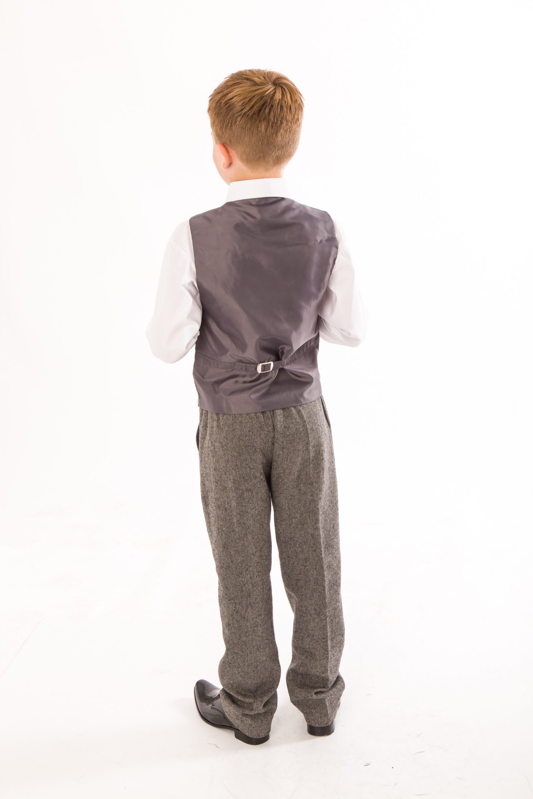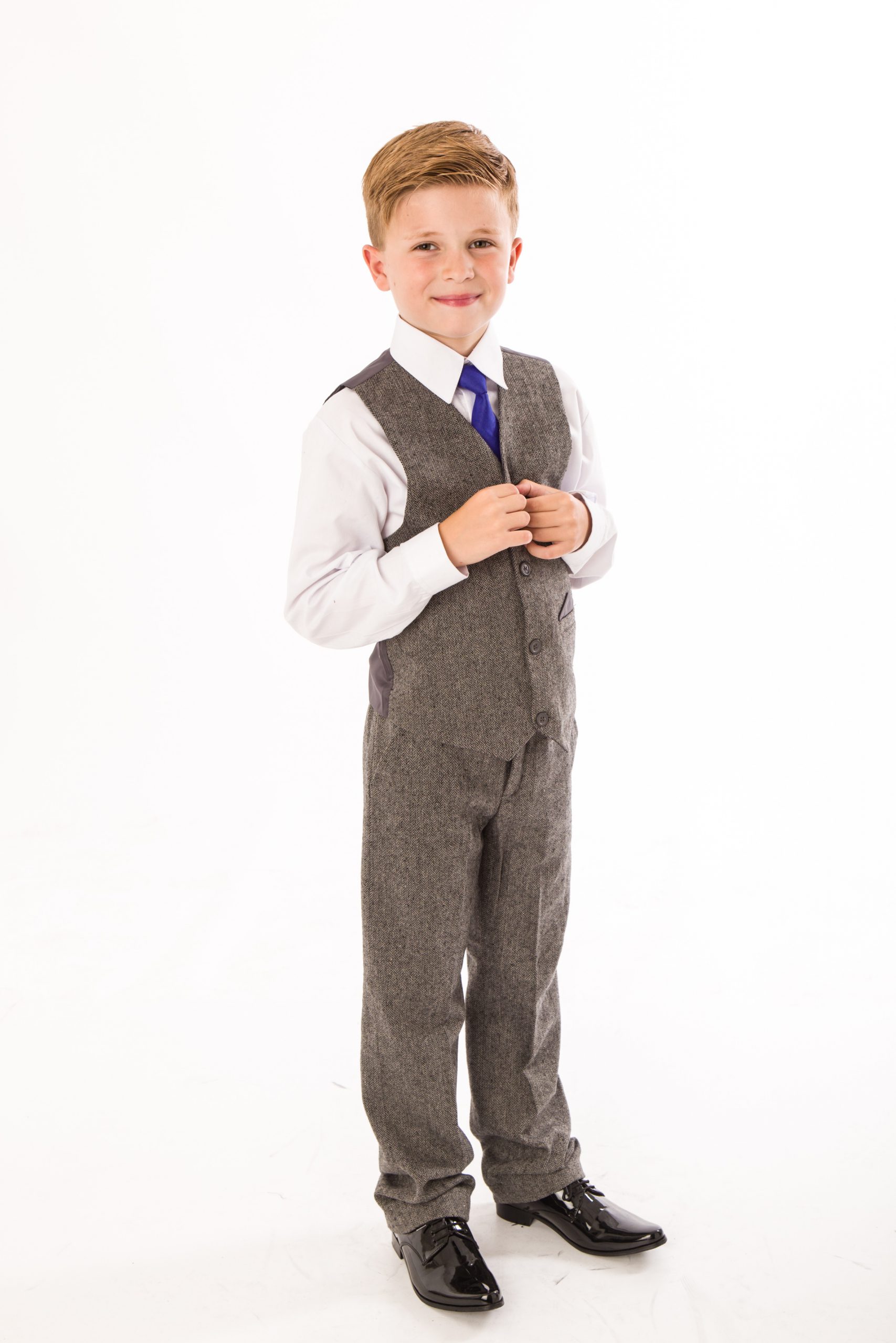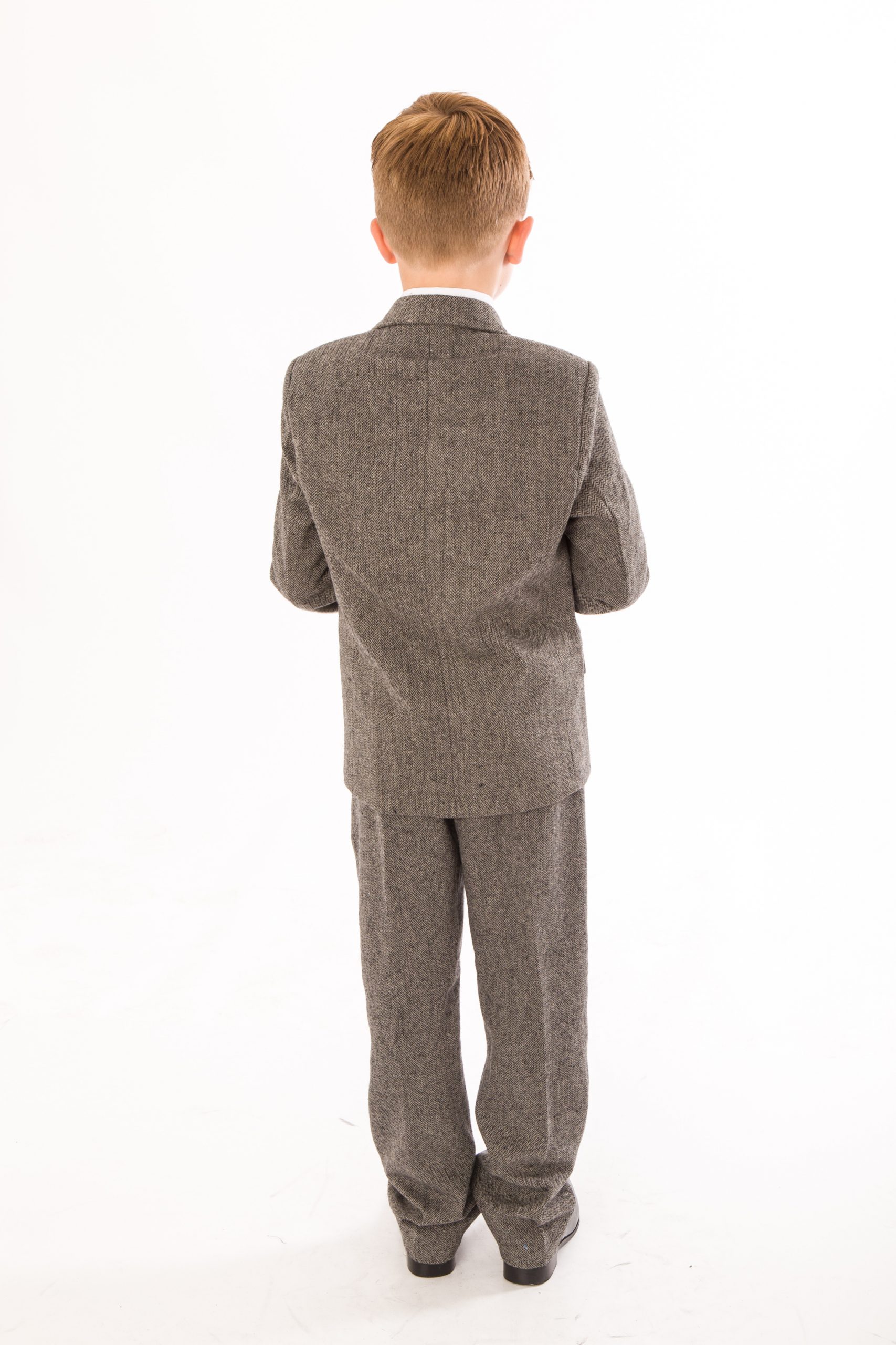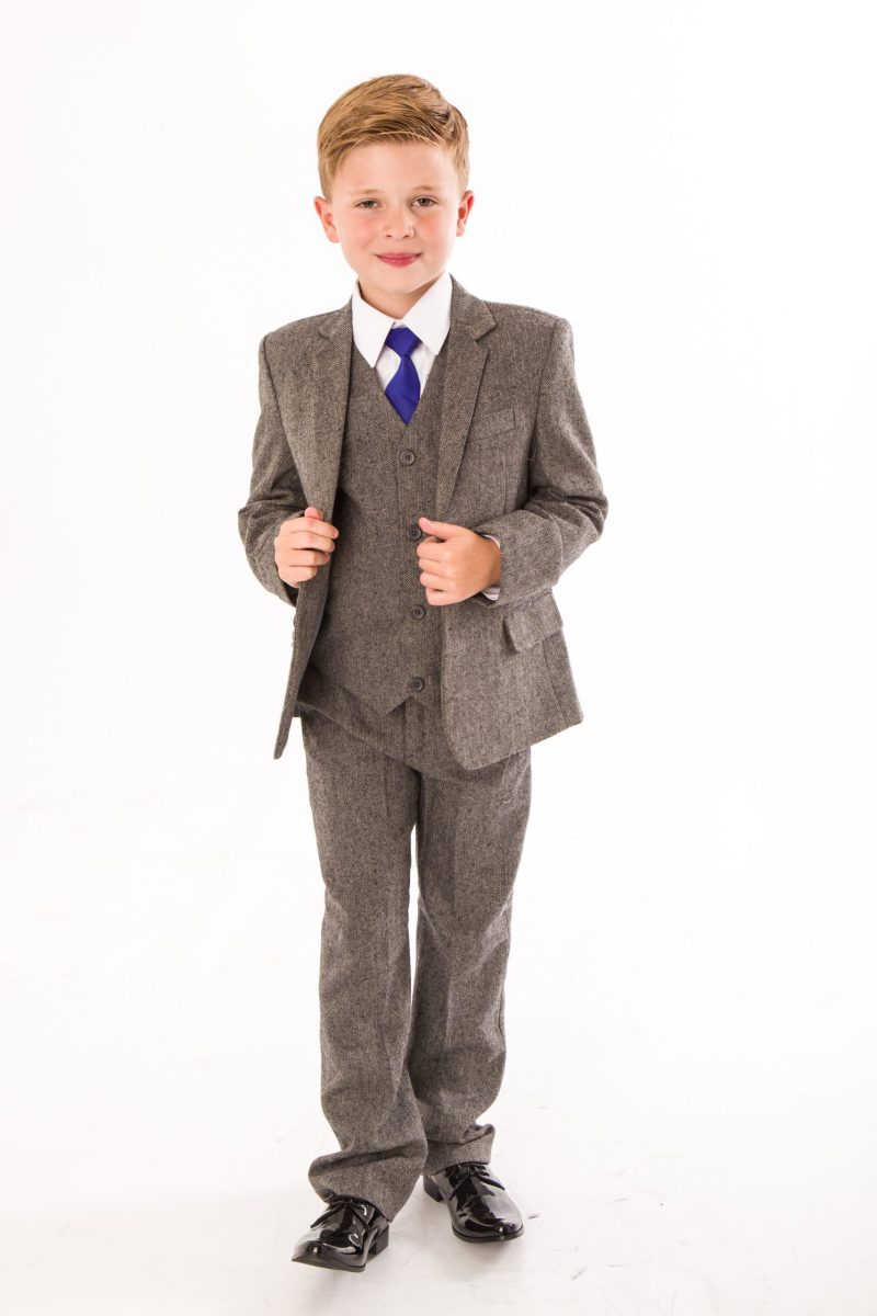 This herringbone-style suit is a five-piece ensemble that includes a finely tailored tweed blazer and waistcoat, matching tweed trousers, a white shirt, and a blue tie to complete a sophisticated look. Crafted with high-quality materials and meticulous stitching, this suit reflects current trends in herringbone tweed. It is an excellent choice to ensure your young gentleman is well-dressed for any occasion.