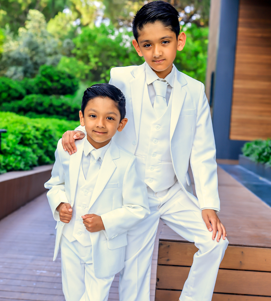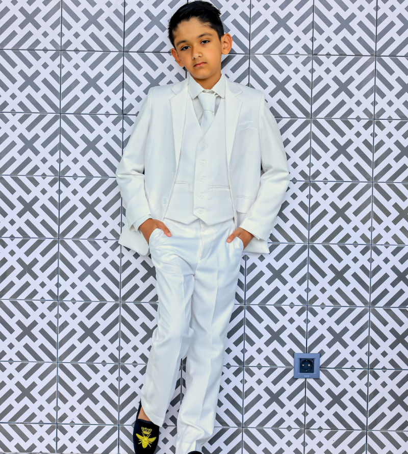 A premium luxury suit by Vivaki. This complete 5-piece slim-fit ensemble includes a 2-button jacket, trousers with an adjustable waist, a matching 4-button waistcoat, a crisp white shirt, and a coordinating tie. Ensure your young gentleman looks sharp and distinguished, creating memorable moments with this stylish suit.