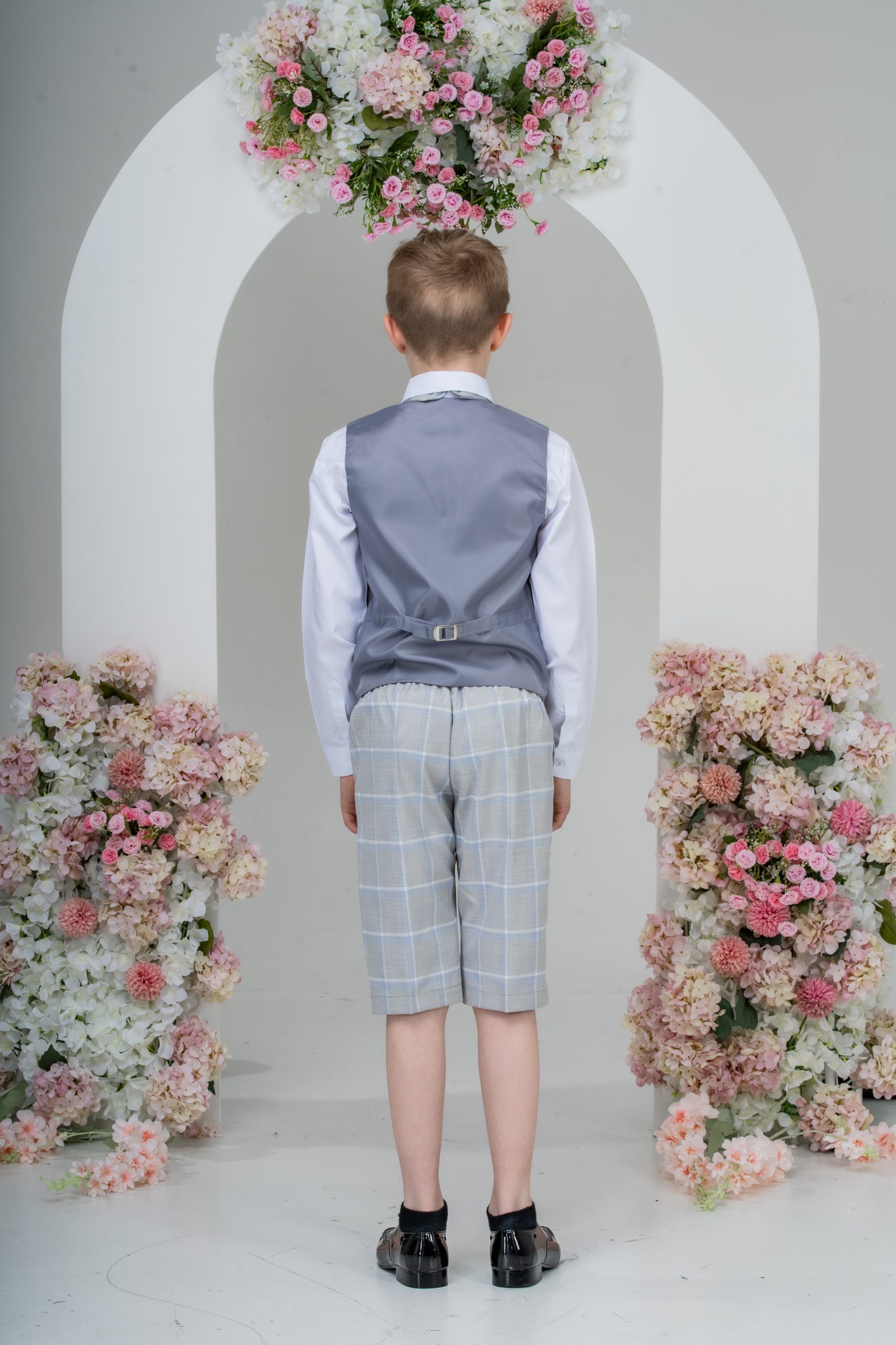 This 4-piece light grey check shorts suit includes shorts, a waistcoat, a shirt, and a bow tie. Ideal for formal occasions, it combines style and comfort for your little one.