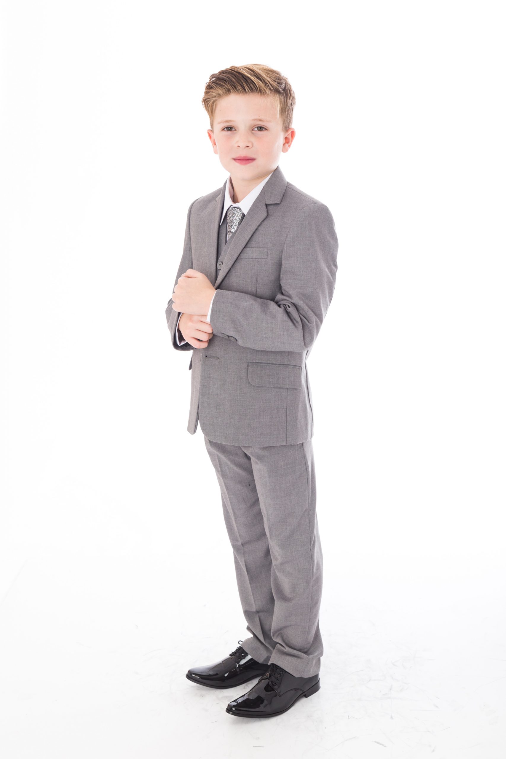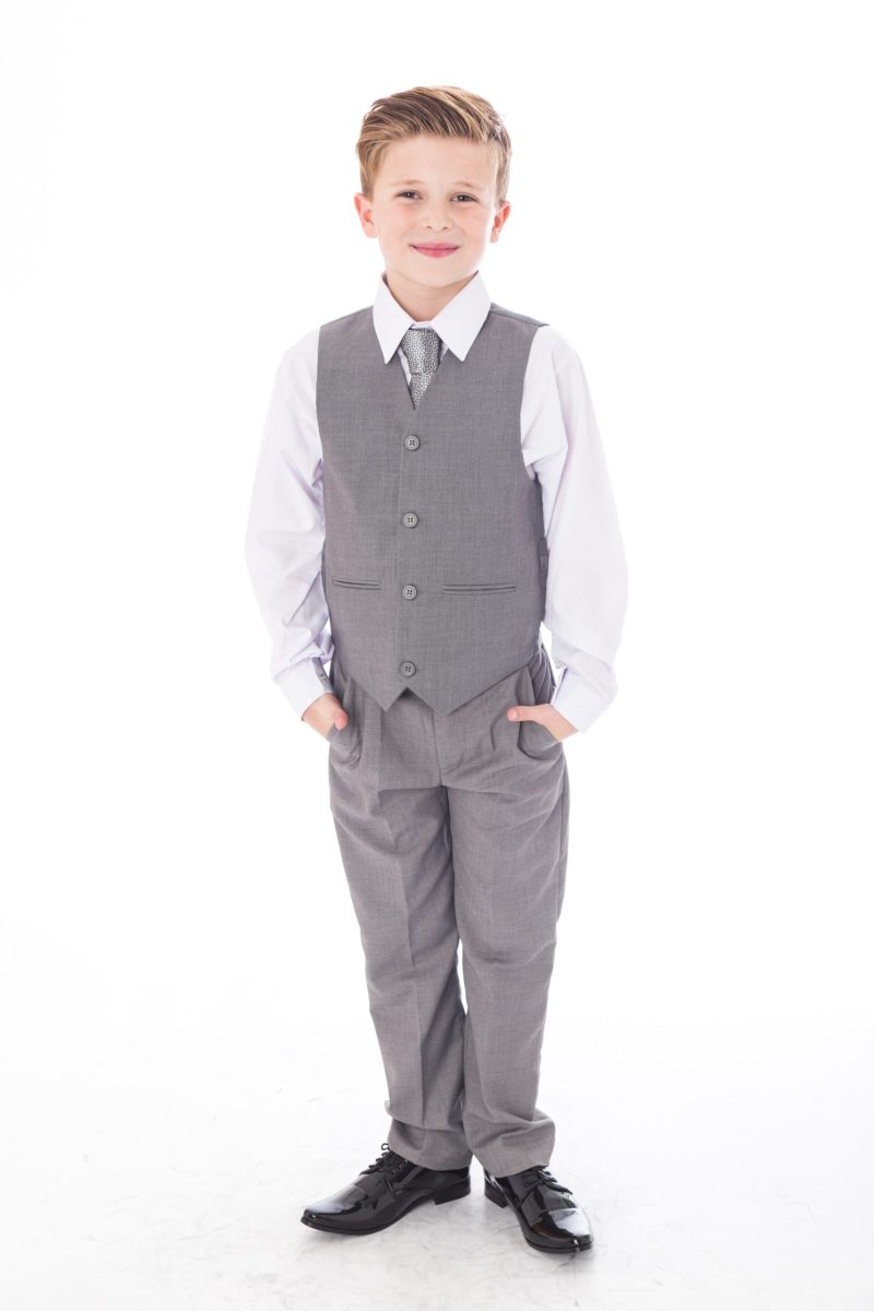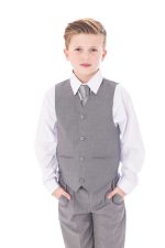 - A matching, fully lined grey waistcoat with an adjustable clasp for a customized fit