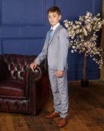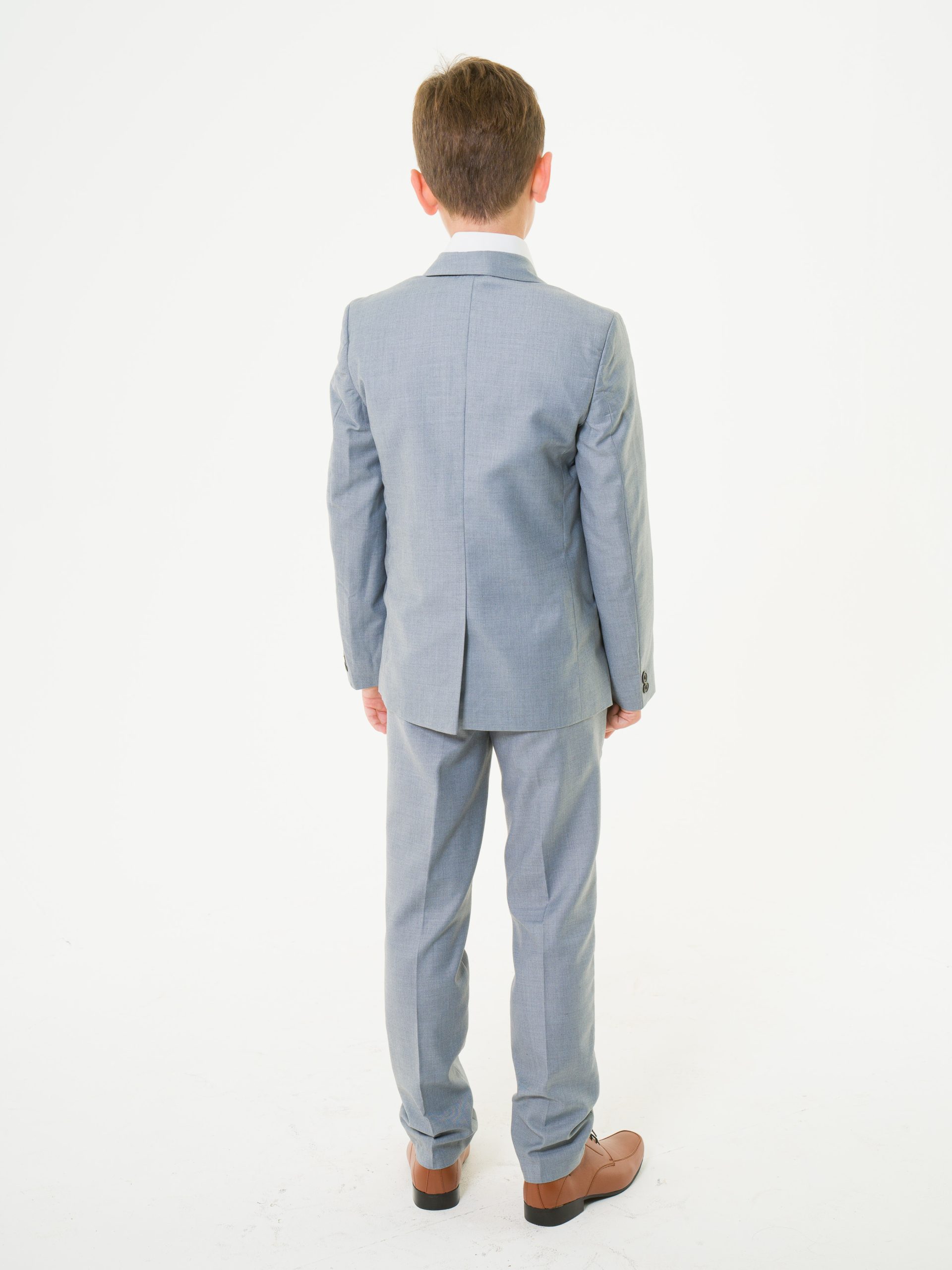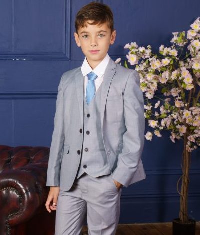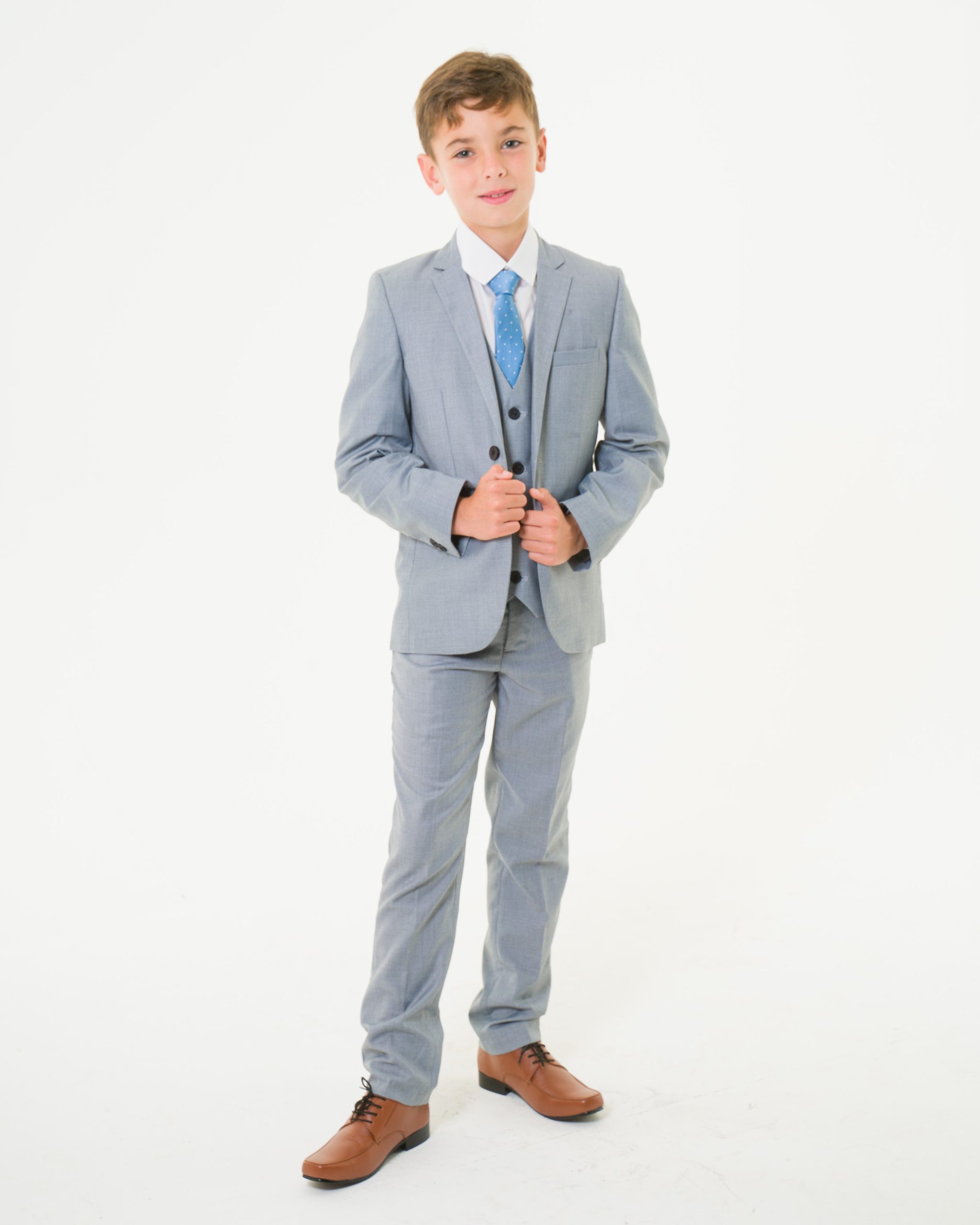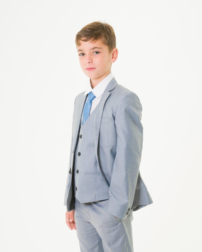 A high-quality luxury suit designed by Milano Mayfair. This complete five-piece slim-fit ensemble includes a two-button jacket, trousers with an adjustable waist, a matching four-button waistcoat, a crisp white shirt, and a coordinating tie. Ensure your young gentleman looks sharp and makes every occasion special with this suit.
