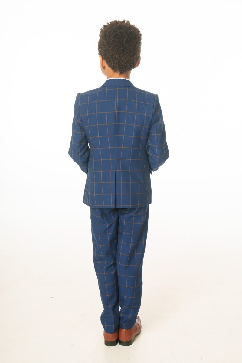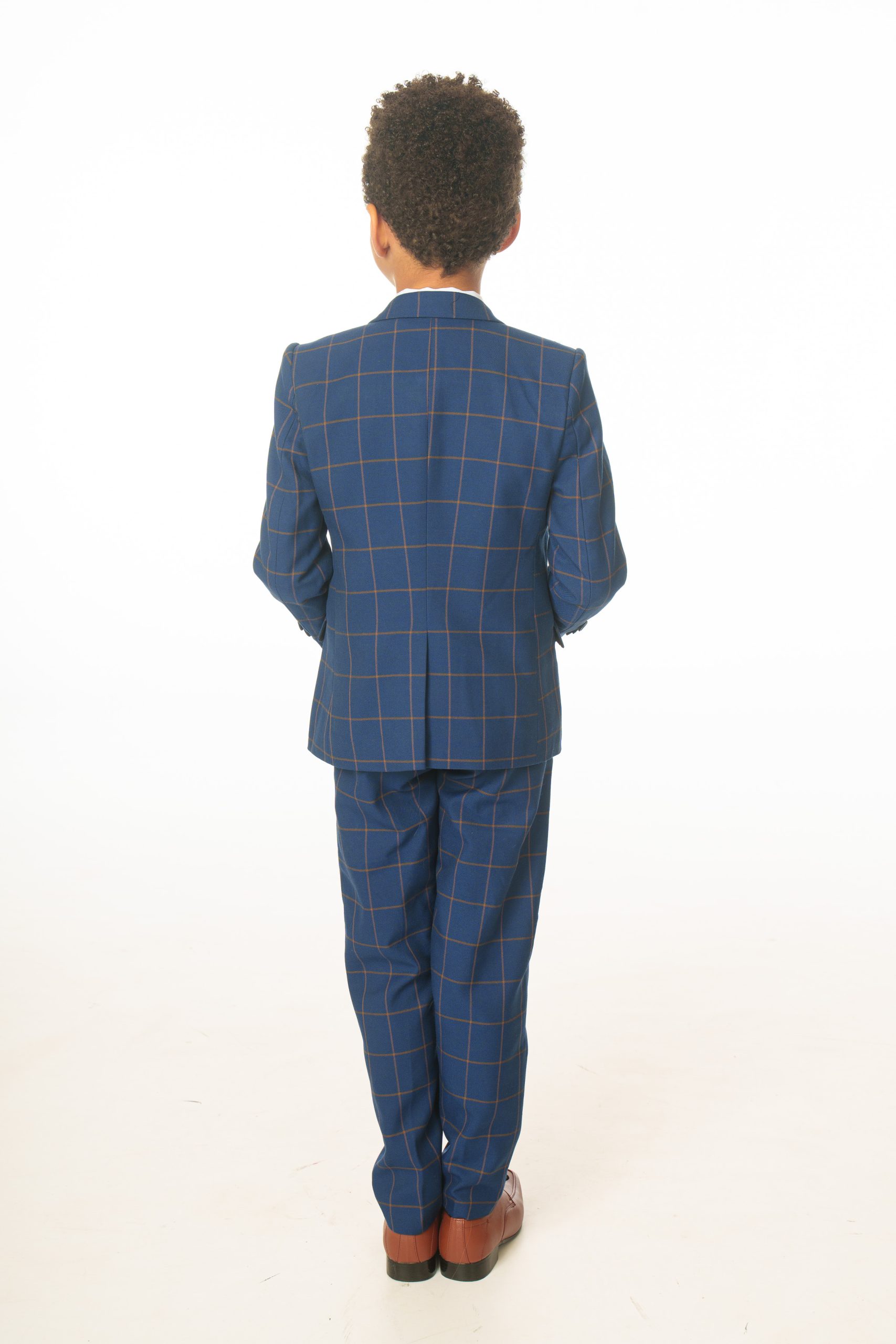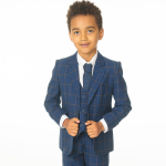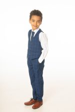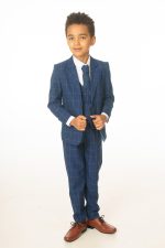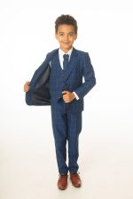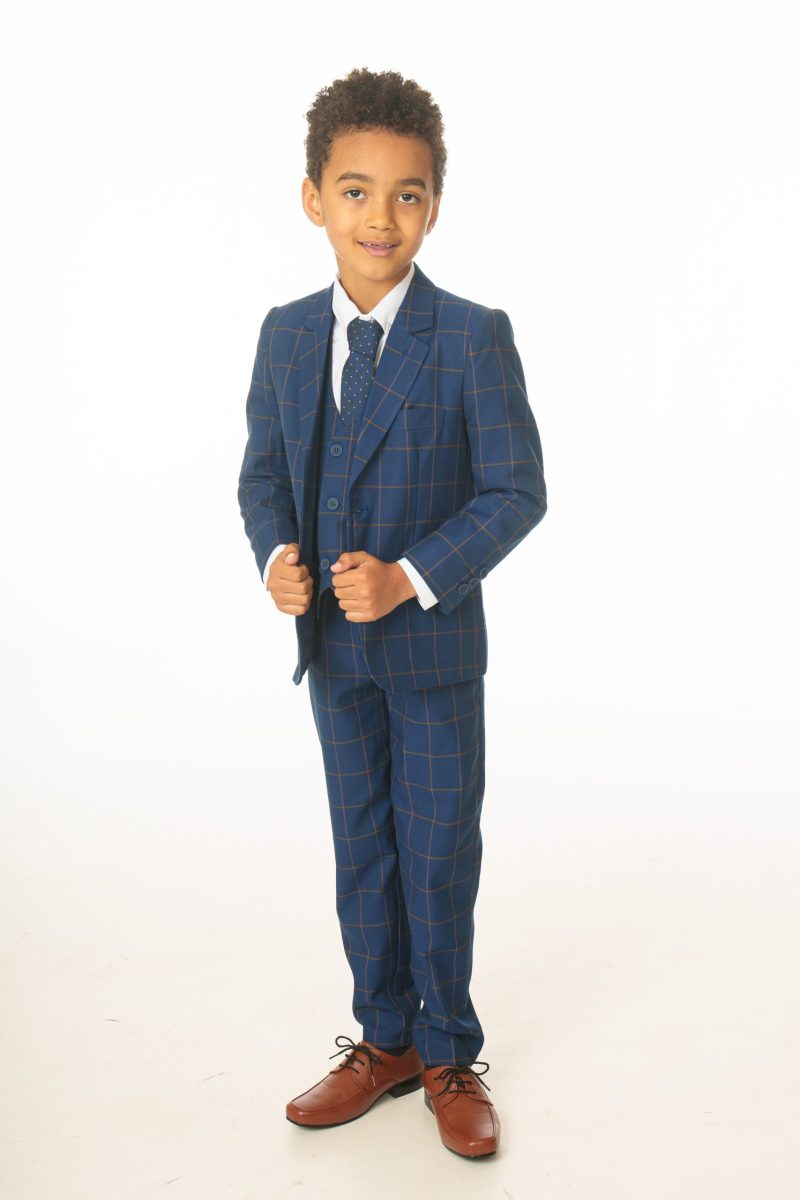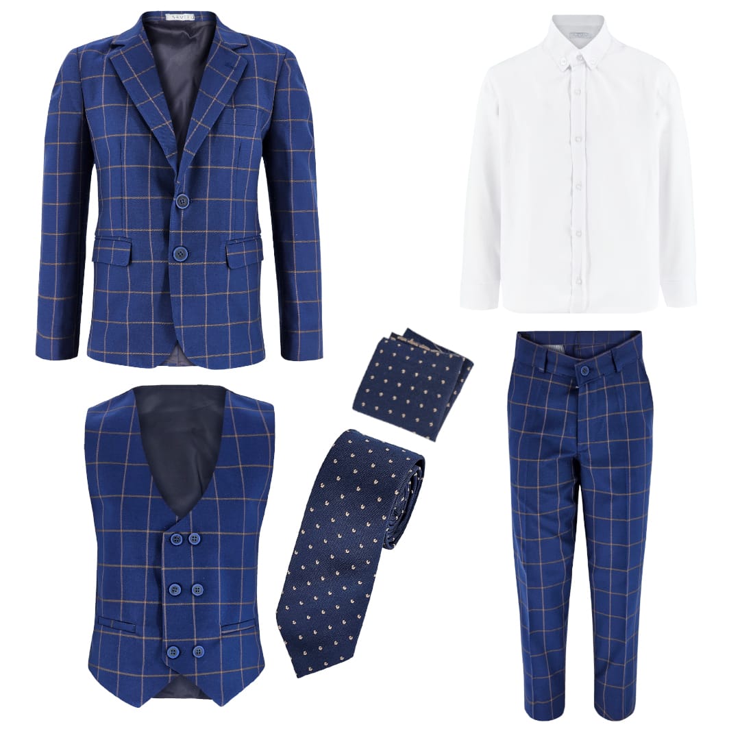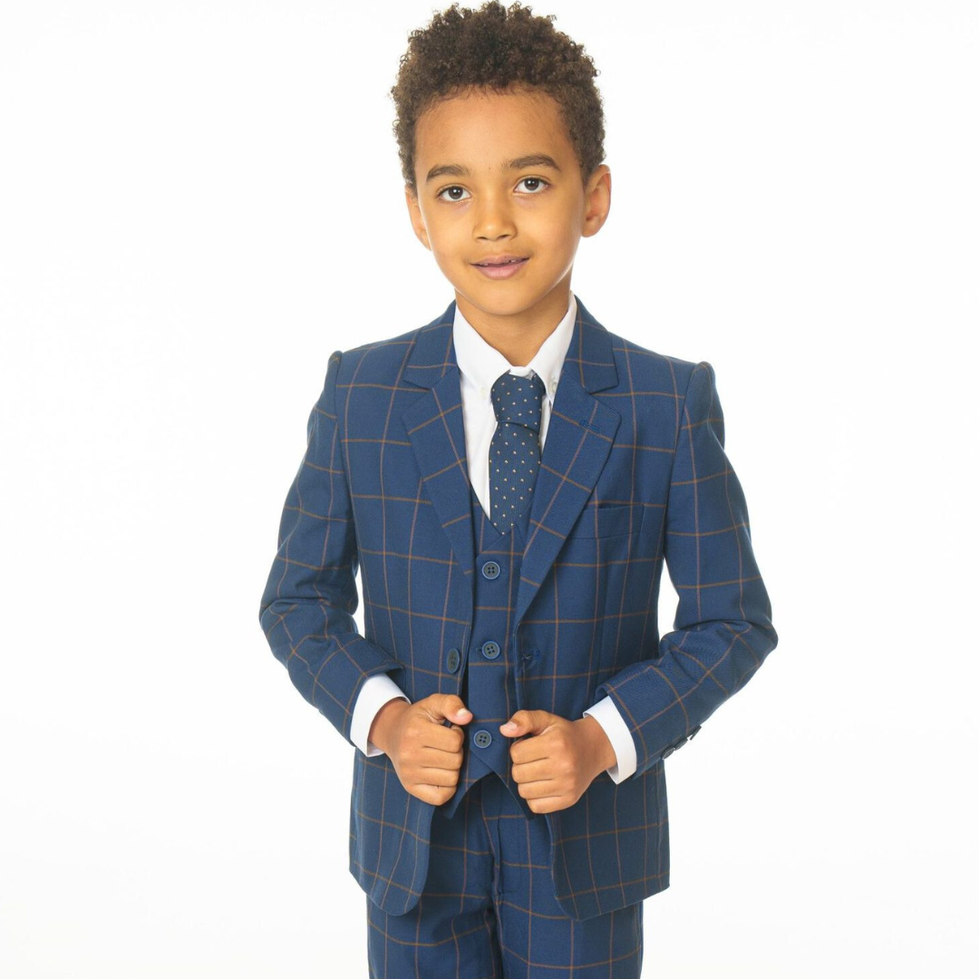 Boys’ classic five-piece navy check suit. A stylish choice to make a memorable impression.