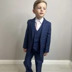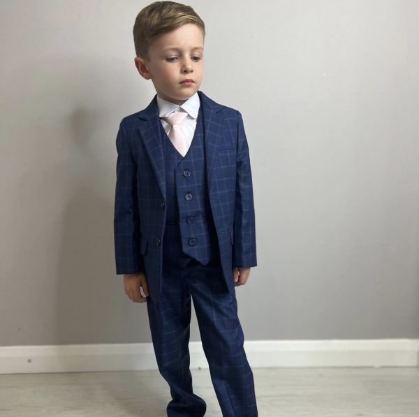 Elevate your appearance with this sophisticated navy check suit. The crisp white shirt and light pink tie complement the rich navy fabric, creating an elegant and standout ensemble.