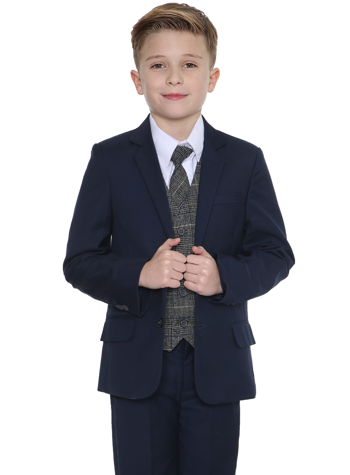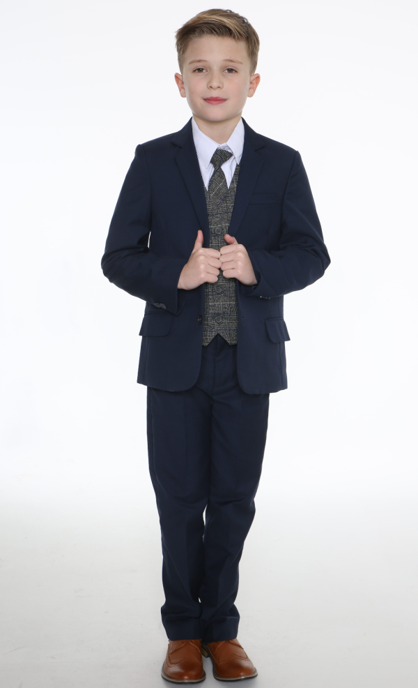This stylish navy suit features a distinctive chequered waistcoat and coordinating tie. The waistcoat’s design incorporates various lines of white and grey, making it a prominent element of the ensemble. Subtle hints of blue within the pattern complement the navy jacket and trousers. The look is completed with a crisp white shirt for a polished appearance.