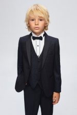 Boys Navy Tuxedo Suit Glitter Jacket. Be sure to make a bold statement with this boys dazzling navy Glitter Tuxedo Suit. This boys full 5 piece suit is a true statement piece made to the highest quality.
