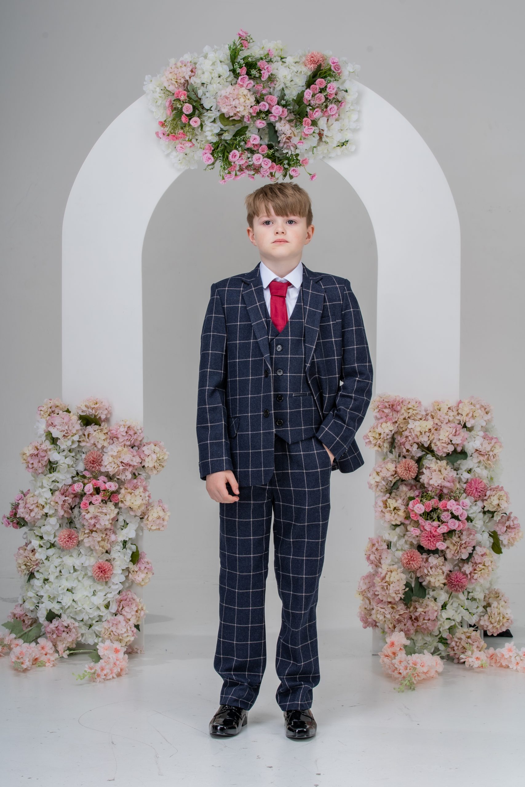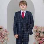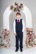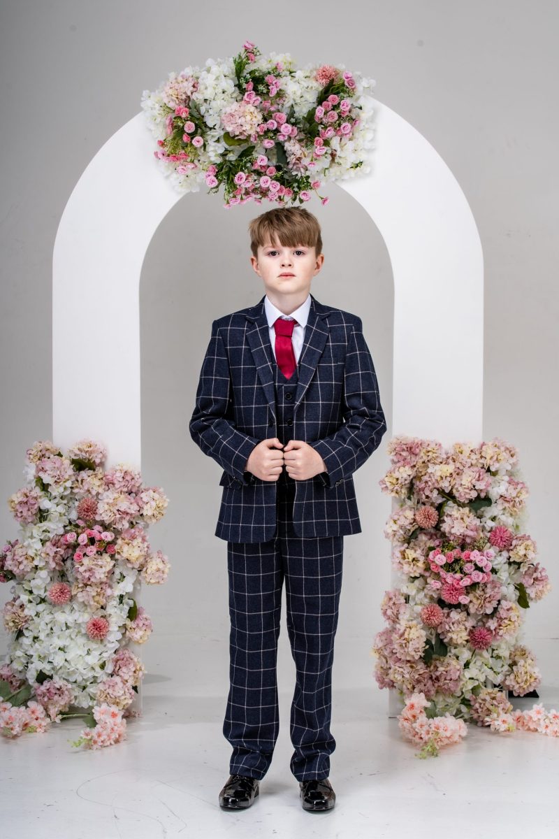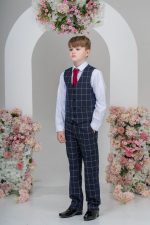 The 5-piece navy and white check suit includes matching trousers, shirt, waistcoat, jacket, and a burgundy tie. An excellent choice for formal occasions.