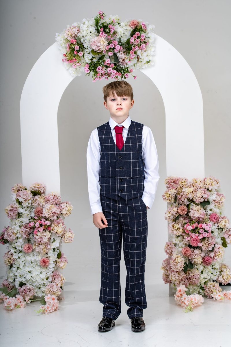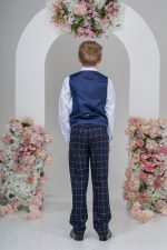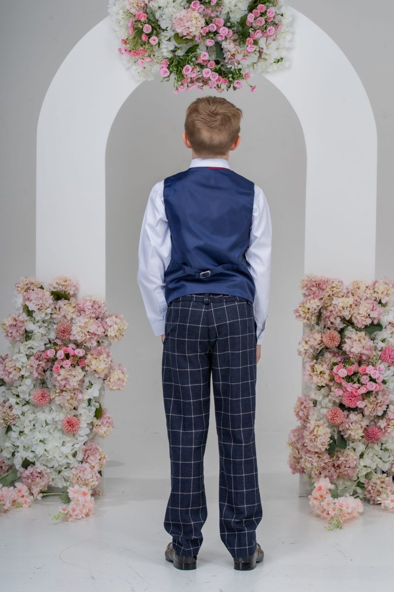 Waistcoat: A navy and white check waistcoat coordinated with the trousers and jacket.
