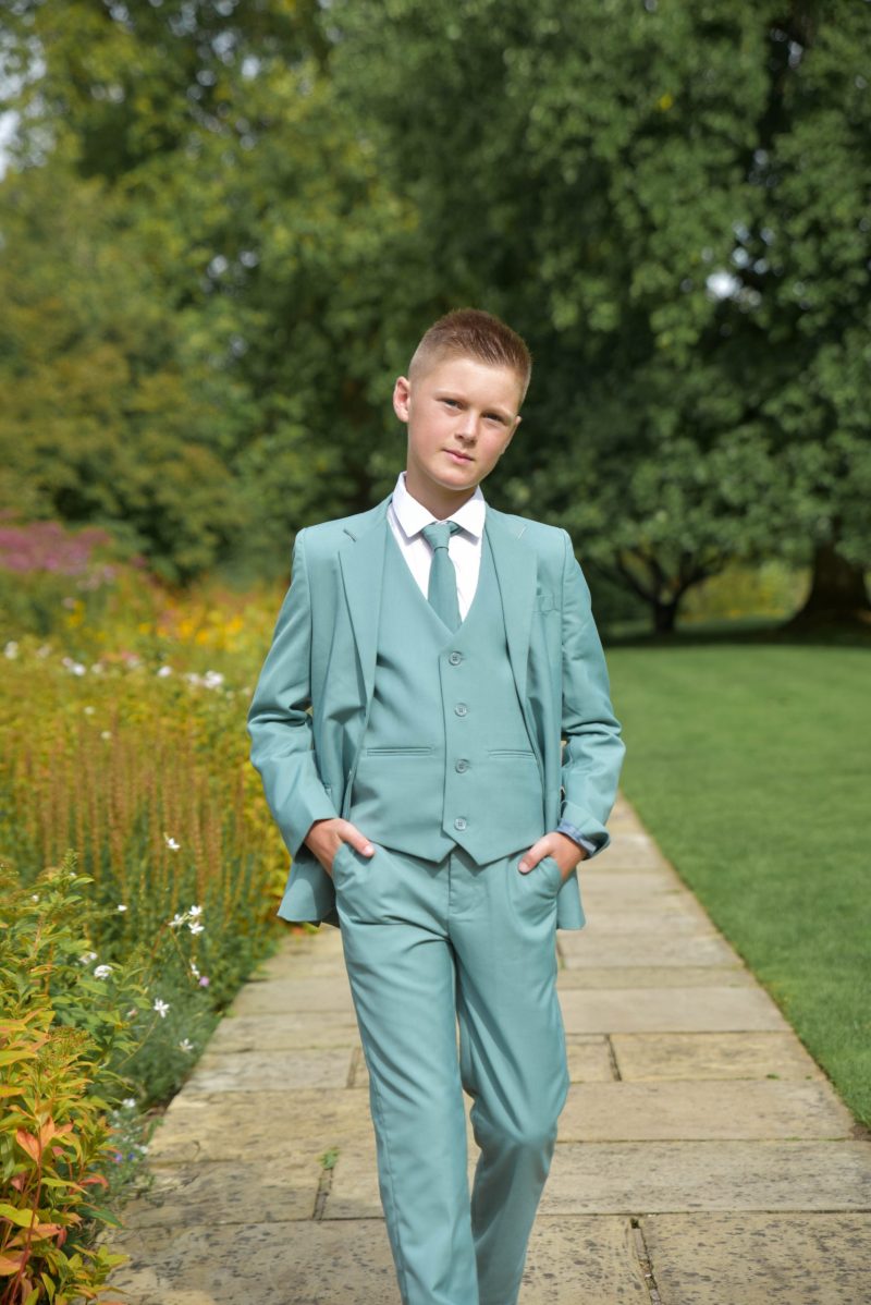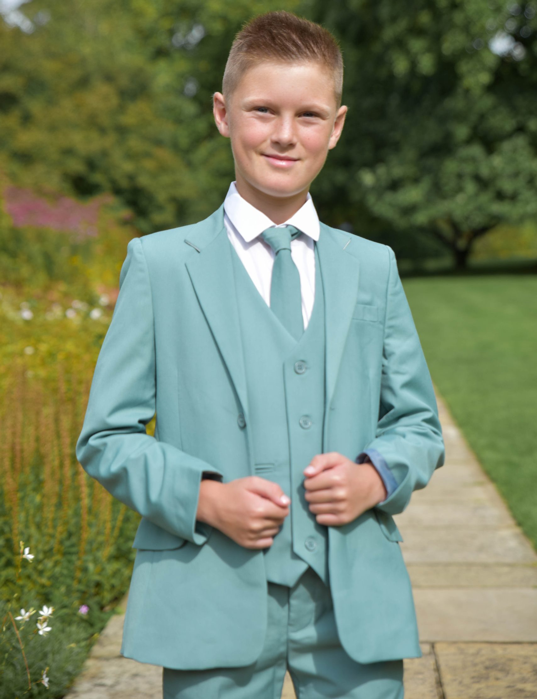 The boys’ 5-piece Sage Premium Suit is a stylish and sophisticated outfit, crafted from a soft sage green fabric. It includes a jacket, waistcoat, trousers, a crisp white shirt, and a matching sage tie, creating a cohesive and polished appearance. The subtle green tone offers a fresh and contemporary take on traditional formalwear, making it suitable for weddings, parties, or other special events. This suit combines comfort with elegance, ensuring a sharp and charming look.