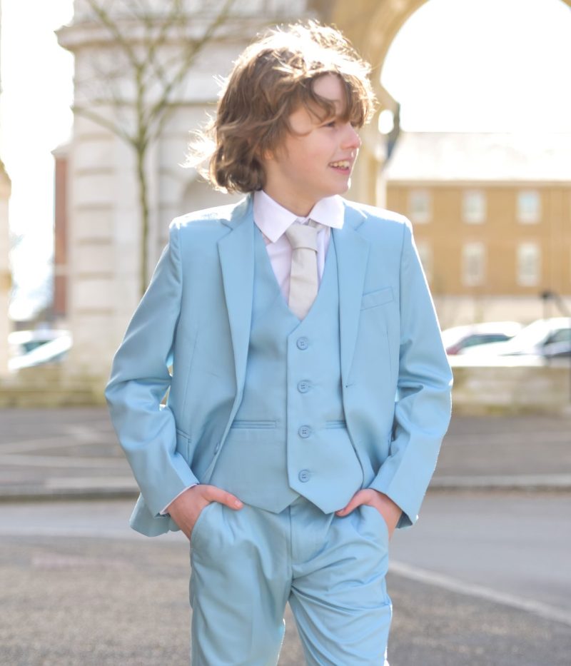 This set includes a sleek two-button sky blue suit jacket, a matching fully lined blue waistcoat with an adjustable clasp for a perfect fit, a classic white long-sleeve collar shirt, steel blue elasticated trousers, and a plain grey tie for the finishing touch.