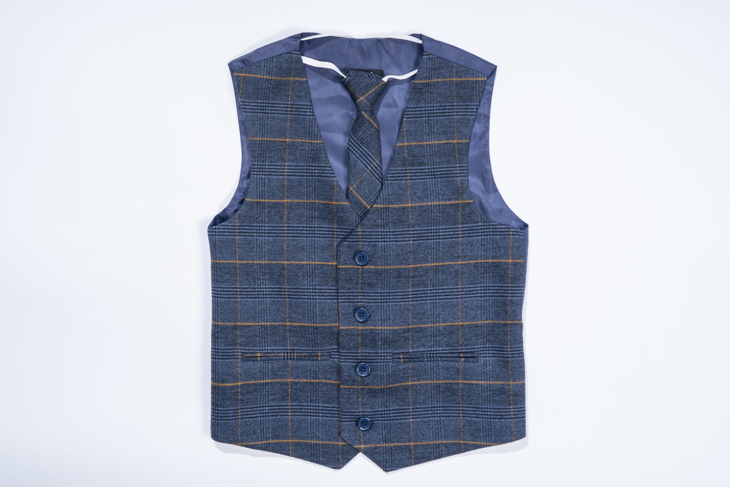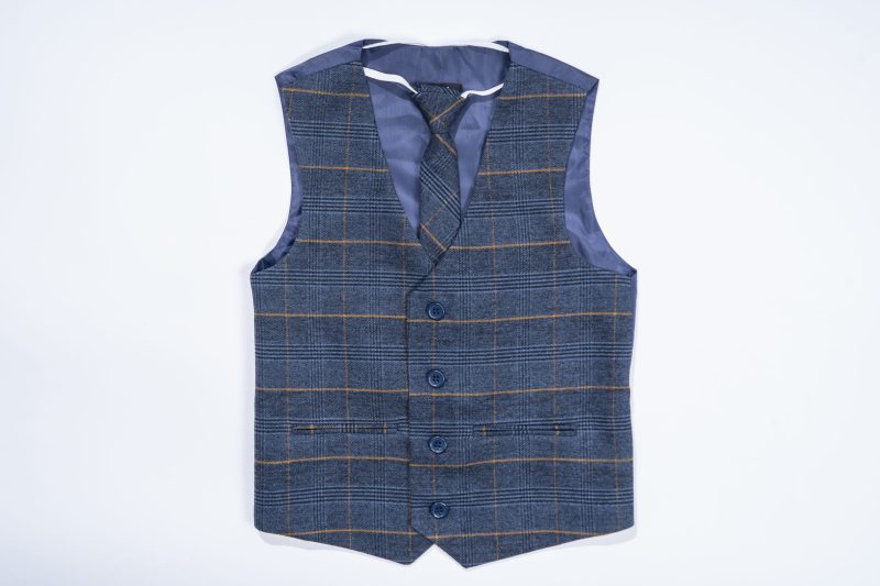 Featuring a navy and orange check pattern and a coordinating tie, it is ideal for various special occasions.