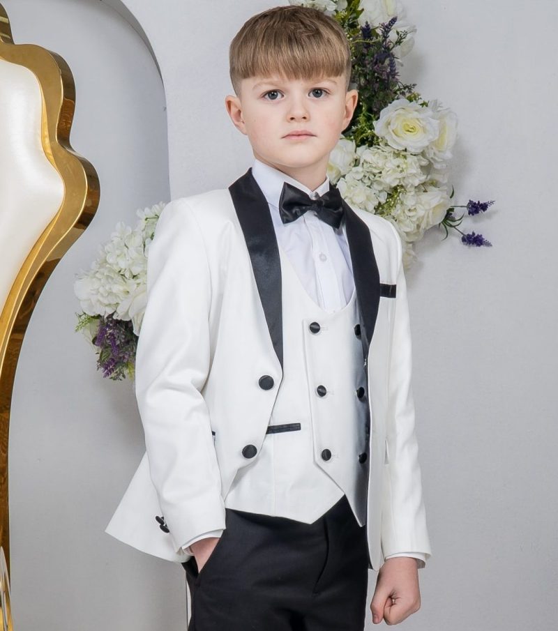 A truly stunning luxury suit by the renowned designers at Milano Mayfair. This exquisite 5-piece slim-fit ensemble features a sophisticated 2-button jacket with a plush velvet lapel, trousers with an adjustable waist for the perfect fit, a matching 4-button waistcoat, a crisp white shirt, and a charming bow tie to complete the look. Make your little gent shine with confidence and style, turning every moment into a treasured memory. This premium suit comes beautifully packaged in a Milano Mayfair suit bag.