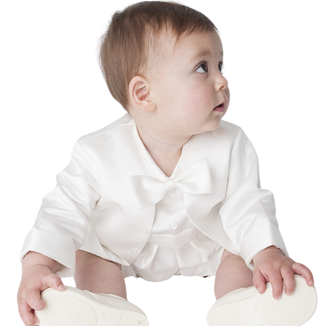 The suit features a satin-like baby gown with convenient bottom buttons. It includes three additional buttons, a bow tie, and a cummerbund, creating a polished and charming look for your young gentleman. Completing the ensemble is a matching four-button, plain jacket, which adds a elegant touch. The suit is available in classic White or Cream.