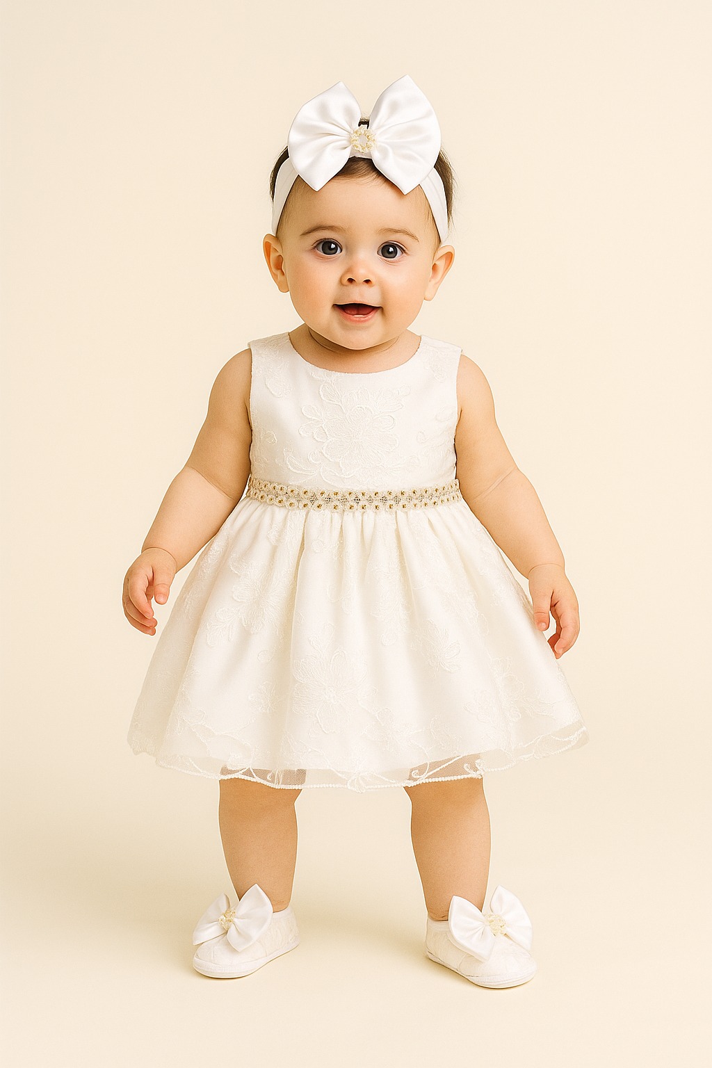 A timeless classic for your little one’s special moments, this ivory baby dress combines elegance and charm effortlessly. Designed with delicate floral embroidery on a soft organza overlay, it features a gold and pearl-embellished waistband that adds a subtle touch of sparkle. The matching satin bow headband and shoes complete the outfit perfectly, making it an ideal choice for weddings, christenings, and celebrations.