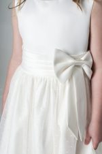 - Waistline: The ivory sash at the waist ties into a bow, providing a structured yet feminine look, enhancing the overall design with delicate charm.