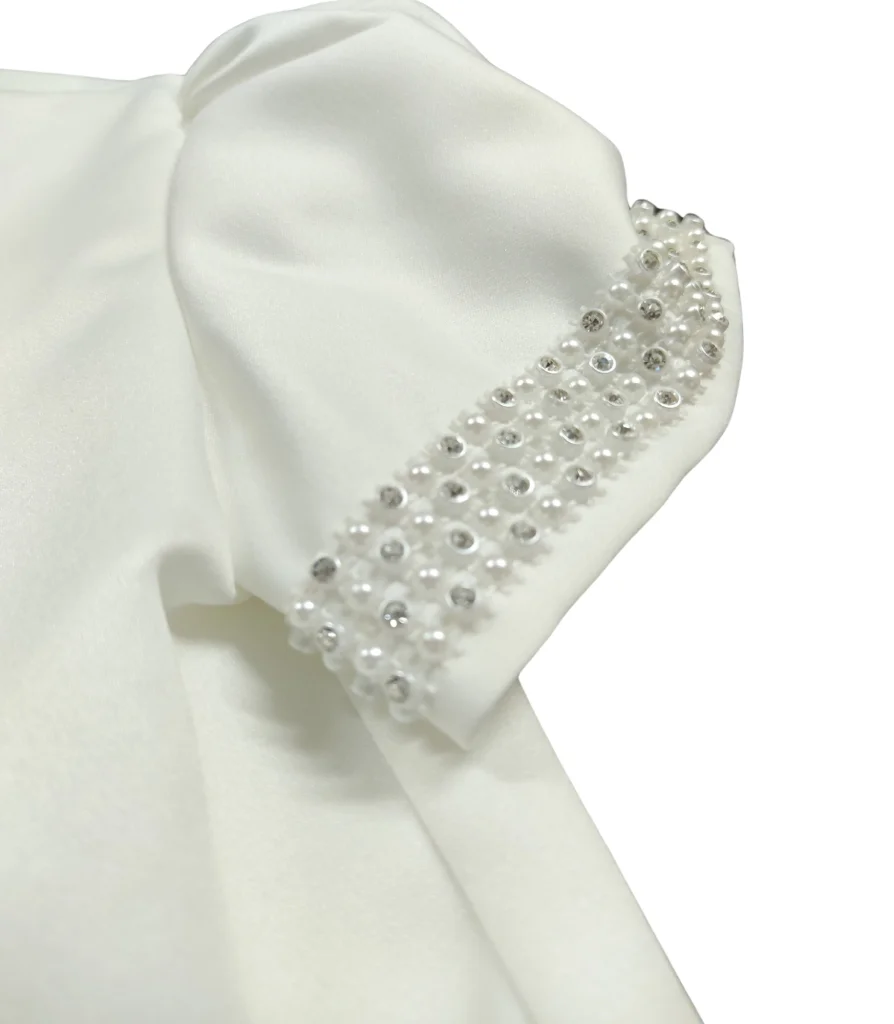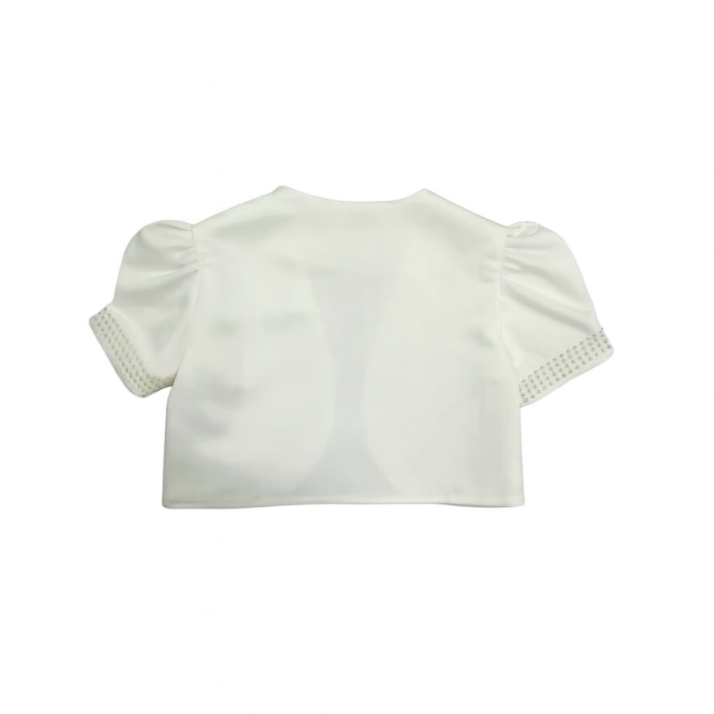 Short-sleeve bolero featuring a layered beaded trim on the sleeve edge.