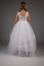 The Bree white hoop dress features a satin sash waist with rosebud detailing, hand-embroidered lace, and a full skirt silhouette created by layers of tulle and a hoop. Perfect for formal occasions.
