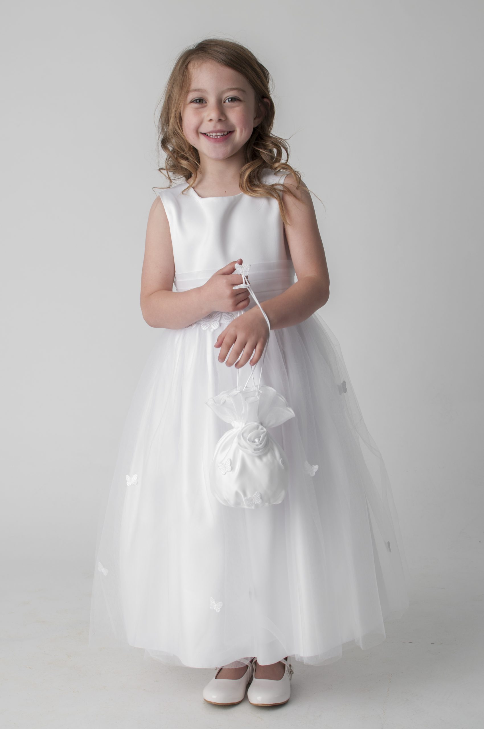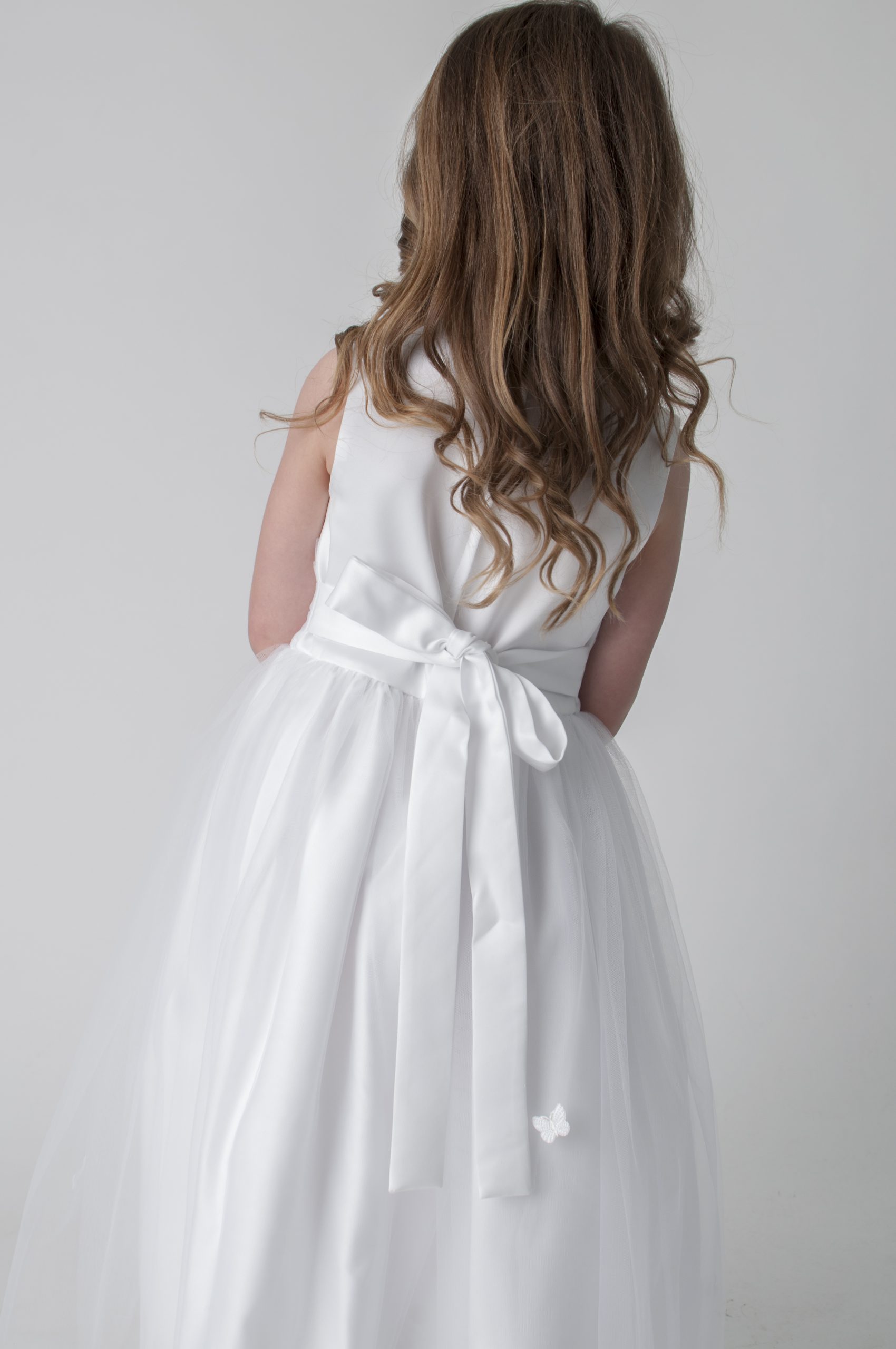 An ivory sleeveless dress with delicate butterfly embroidery, a satin waist sash, and a matching bag—perfect for flower girls and bridesmaids.