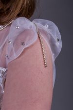- Bodice: The bodice features intricate hand-embroidered beading, enhancing the gown’s refined look.