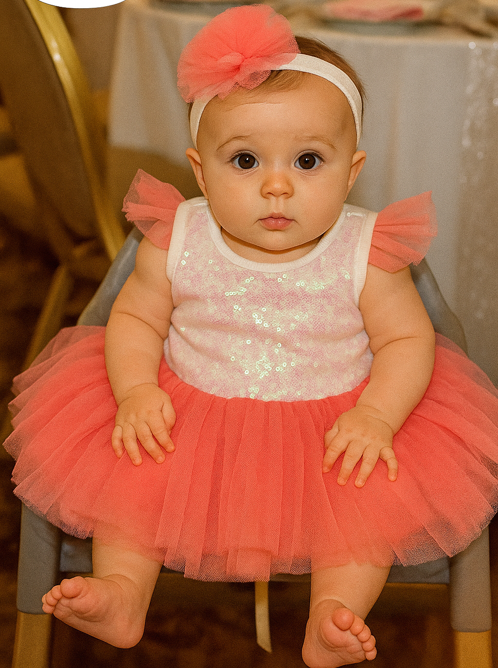 This adorable baby girls’ coral party dress is designed to make any special occasion extra sweet. The bodice features soft, sparkling coral sequins that catch the light gently while remaining comfortable for delicate baby skin. The tulle flutter sleeves add a cute and elegant detail that matches the floaty style of the skirt.