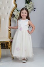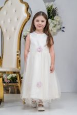 Waistline: A soft pink rosebud sash cinches the waist, adding a gentle pop of color and enhancing the dress’s feminine charm. The waistline is further accentuated with a white satin-like band, offering contrast and sophistication.