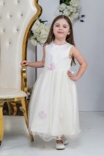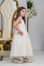 Bodice: The dress features a sleeveless ivory bodice with a satin-like finish, offering a smooth, polished appearance that complements the delicate details below.