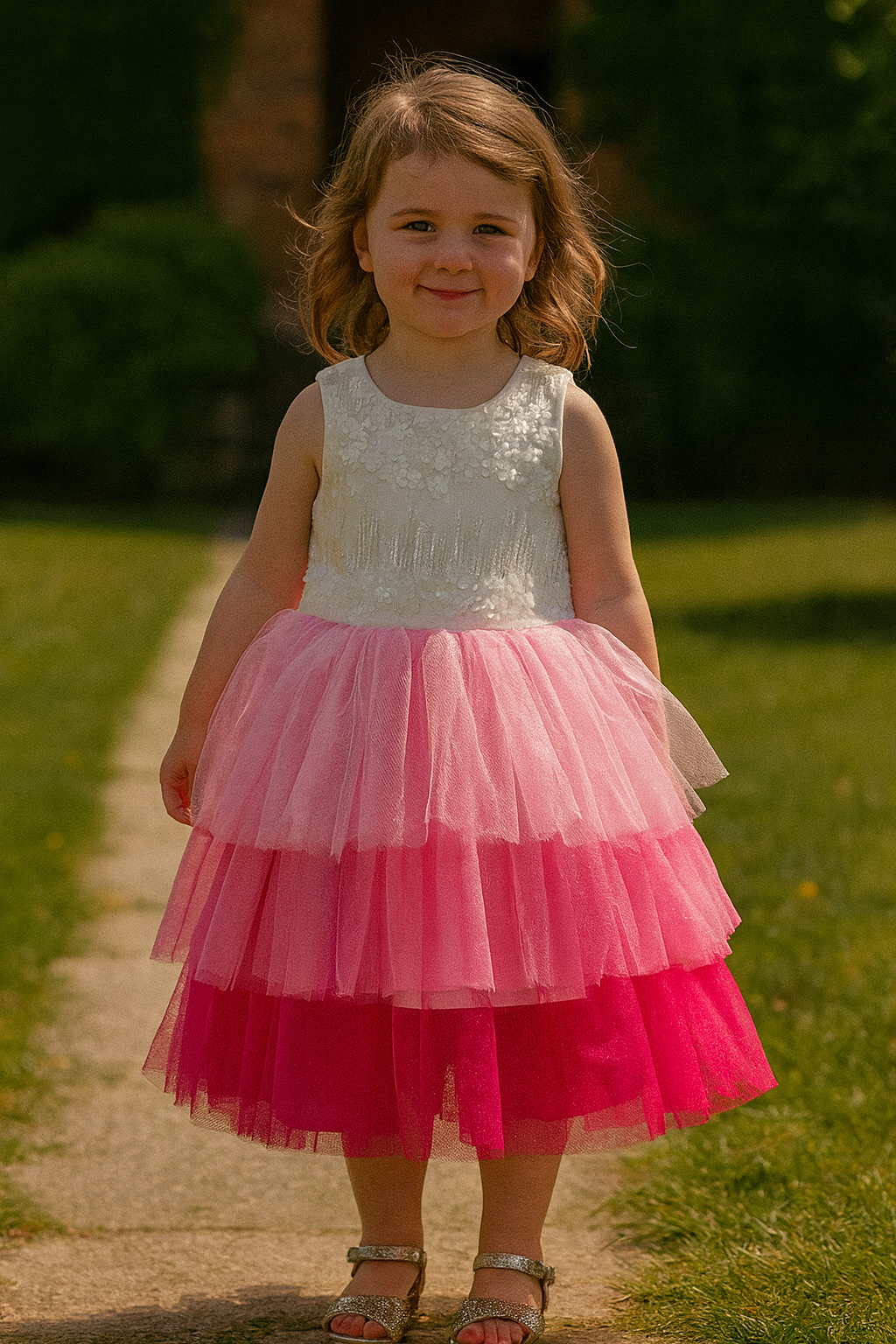 A beautiful toddler party dress featuring a delicate white lace bodice and a stunning ombre pink layered tulle skirt. Soft, floaty, and perfect for birthdays, weddings, photoshoots, and special celebrations.