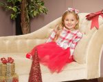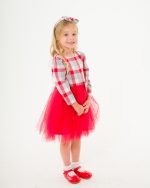 - Bodice: Red and grey tartan pattern, adding a classic, festive touch to the dress.