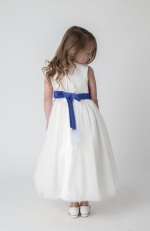 - Back Detail: The navy ribbon ties into a beautiful bow at the back, enhancing the overall feminine design of the dress.