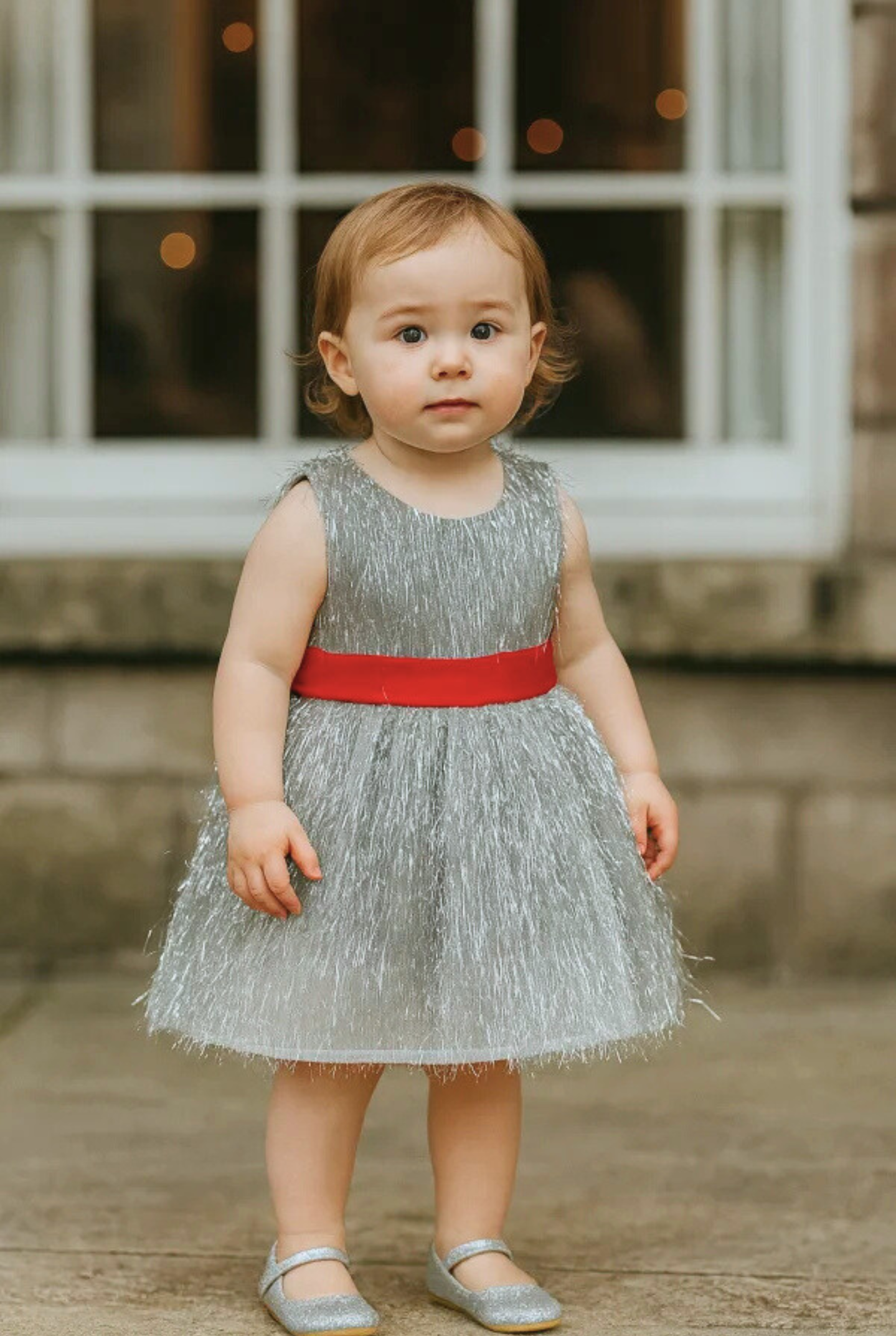 This beautiful toddler girls’ silver sparkle dress is designed to make every special occasion unforgettable. The sleeveless bodice and fully layered skirt are crafted from soft, shimmering silver tulle that catches the light from every angle, creating a magical, glittery effect perfect for festive events. The striking red satin waistband adds a pop of colour and a classic holiday touch.